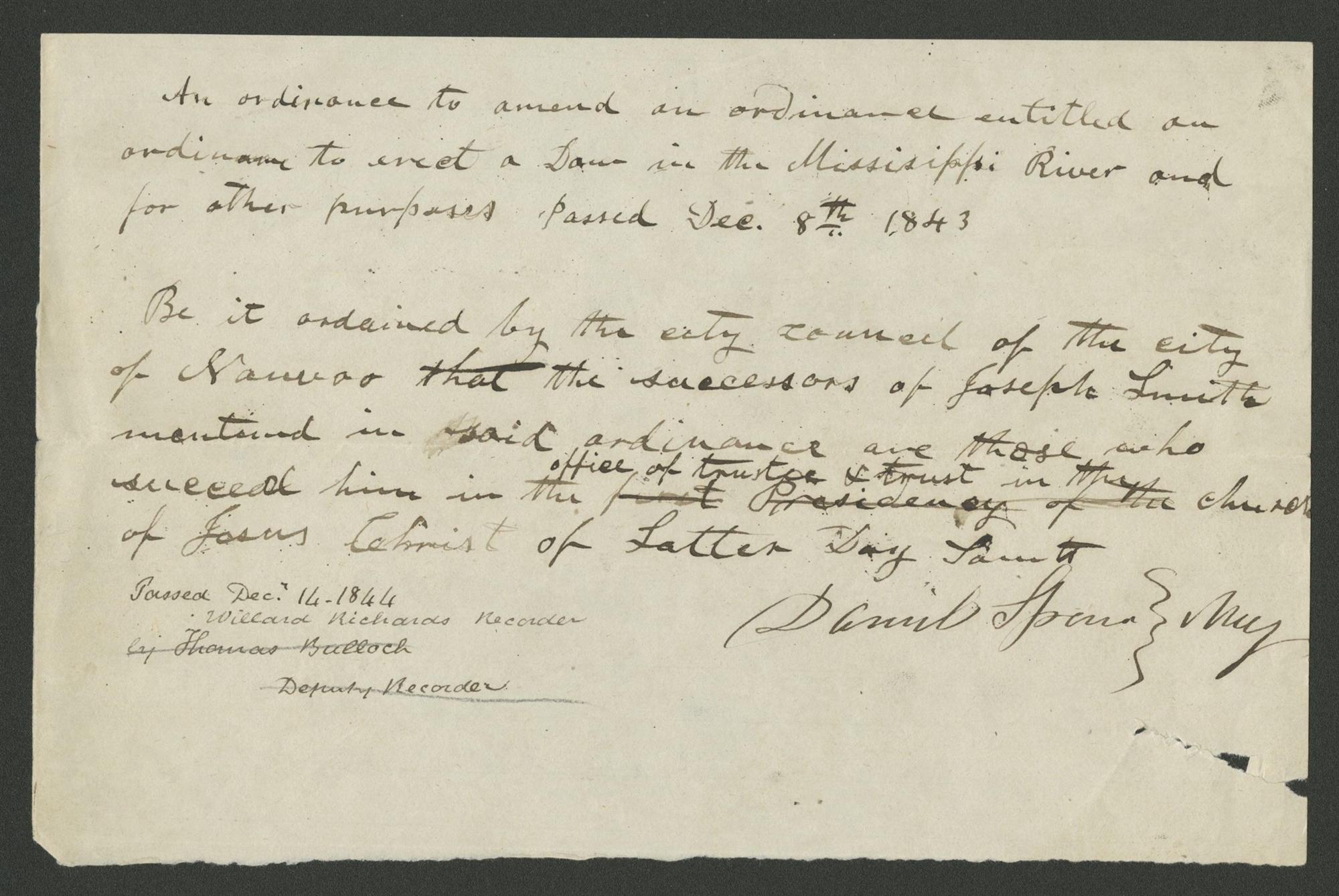 Nauvoo City Council, Ordinance, , Hancock Co., IL, 14 Dec. 1844; handwriting of ; signature of ; endorsements and docket in handwriting of ; one page; Nauvoo, IL, Records, 1841–1844, CHL.