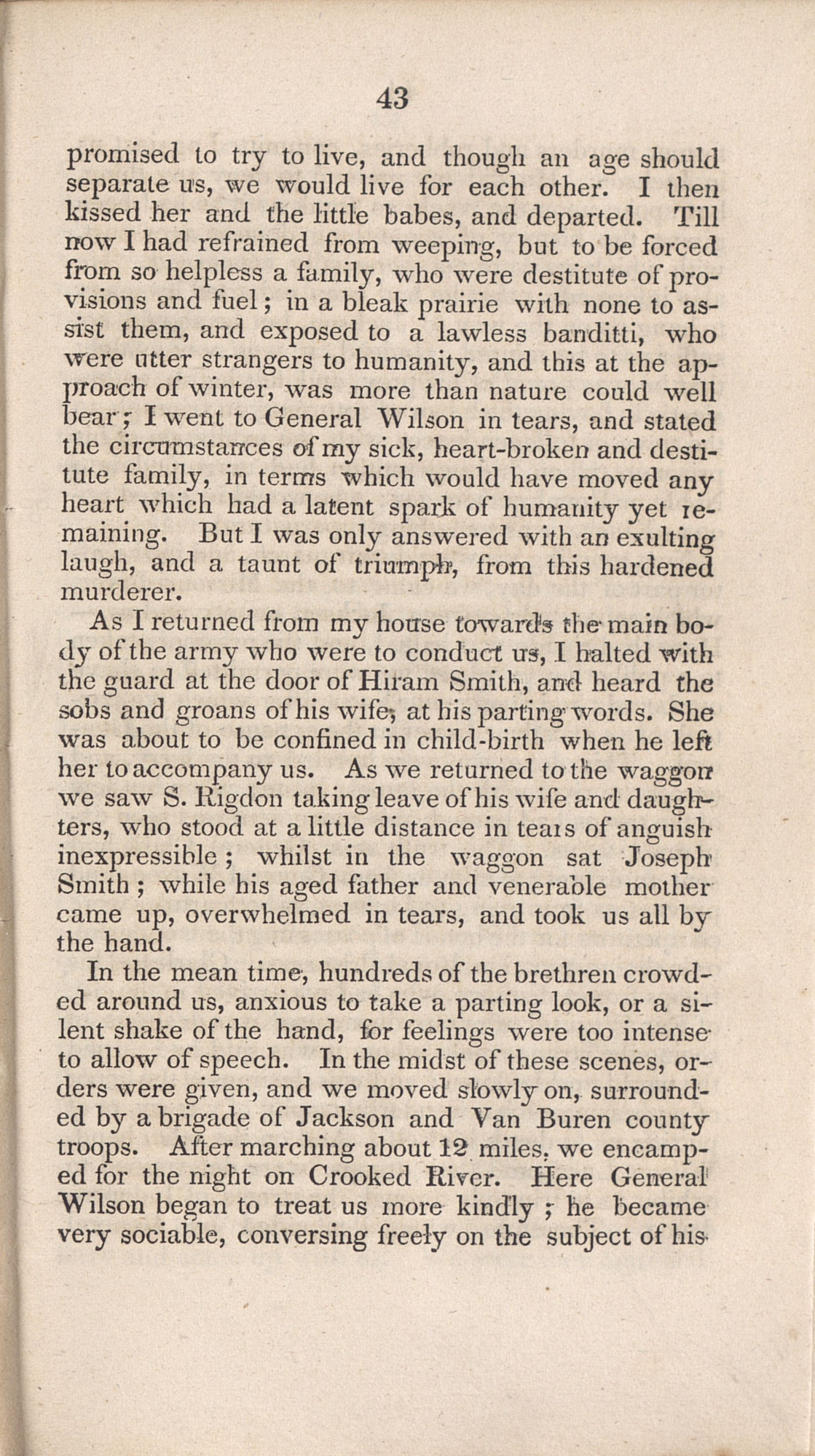 promised to try to live, and though an age should separate us, we would live for each other. I then kissed her and the little babes, and departed. Till now I had refrained from weeping, but to be forced from so helpless a family, who were destitute of provisions and fuel; in a bleak prairie with none to assist them, and exposed to a lawless banditti, who were utter strangers to humanity, and this at the approach of winter, was more than nature could well bear; I went to in tears, and stated the circumstances of my sick, heart-broken and destitute family, in terms which would have moved any heart which had a latent spark of humanity yet remaining. But I was only answered with an exulting laugh, and a taunt of triumph, from this hardened murderer.