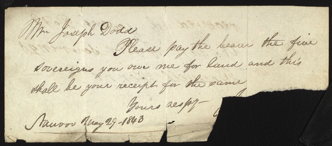 [JS], Pay Order and Receipt, to Joseph Dodd, , Hancock Co., IL, 29 May 1843; handwriting of ; notation in handwriting probably of Roswell Ferre; one page; JS Collection, CHL.
