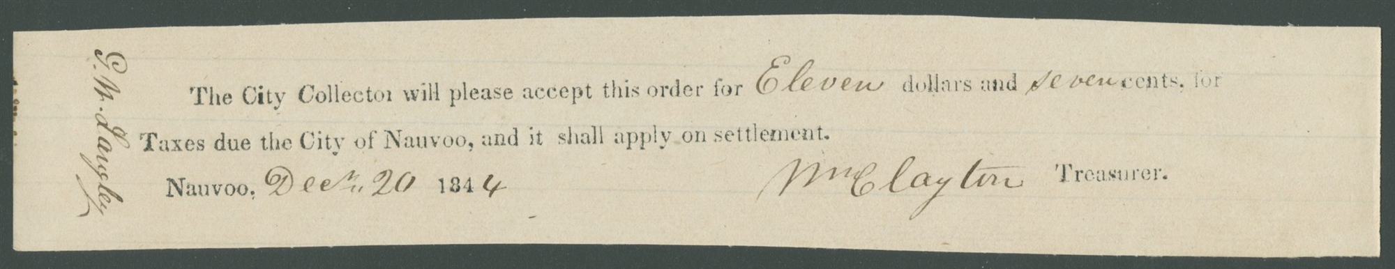 , Pay Order, to Nauvoo City Collector, for George W. Langley, , Hancock Co., IL, 20 Dec. 1844; printed form with manuscript additions in handwriting of ; notation in handwriting of ; one page; Nauvoo, IL, Records, 1841–1845, CHL.