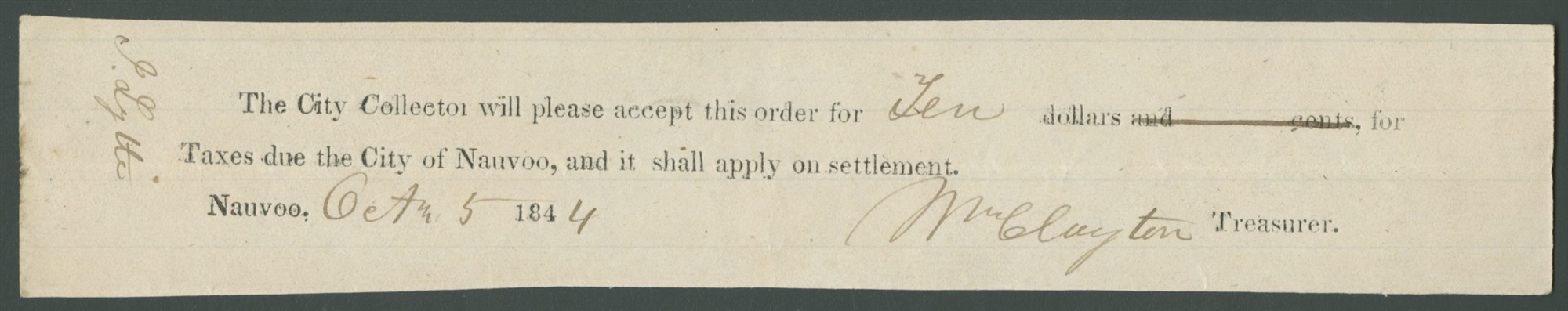 Pay Order, William Clayton to Nauvoo City Collector for John Lytle, 5 October 1844–C