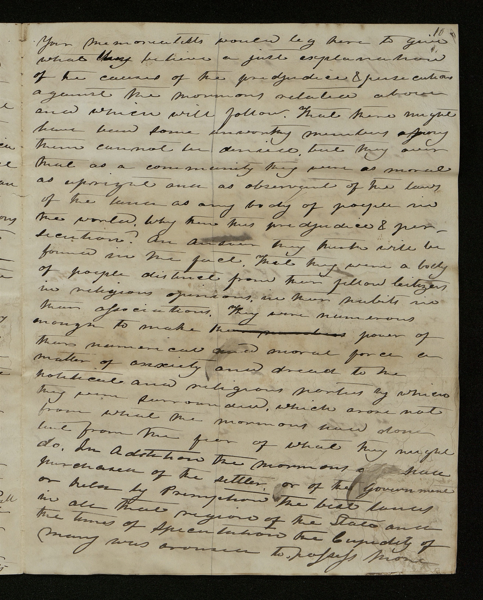 Your memorialists would beg here to give what they believe a just explanation of the causes of the predjudice & persecutions against the related above and which will follow. That there might have been some unworthy members among them cannot be denied, but they own that as a community they were as moral as upright and as observant of the laws of the land as any body of poeple in the world, Why then this predjudice & persecution? An answer they think will be found in the fact, That they were a body of people distinct from their fellow Citizens in religious opinions, in their habits in their associations. They were numerous enough to make their numbers power of theirs numerical and moral force a matter of anxiety and dread to the political and religious parties by which they were surrounded, which arose not from what the Mormons had done but from the fear of what they might do. In Addition the Mormons either had purchased of the settler, of or of the Government or held by Pr[e]emption the best lands in all that region of the and the terms of speculation the Cupidity of many was aroused to possess More [p. 10]