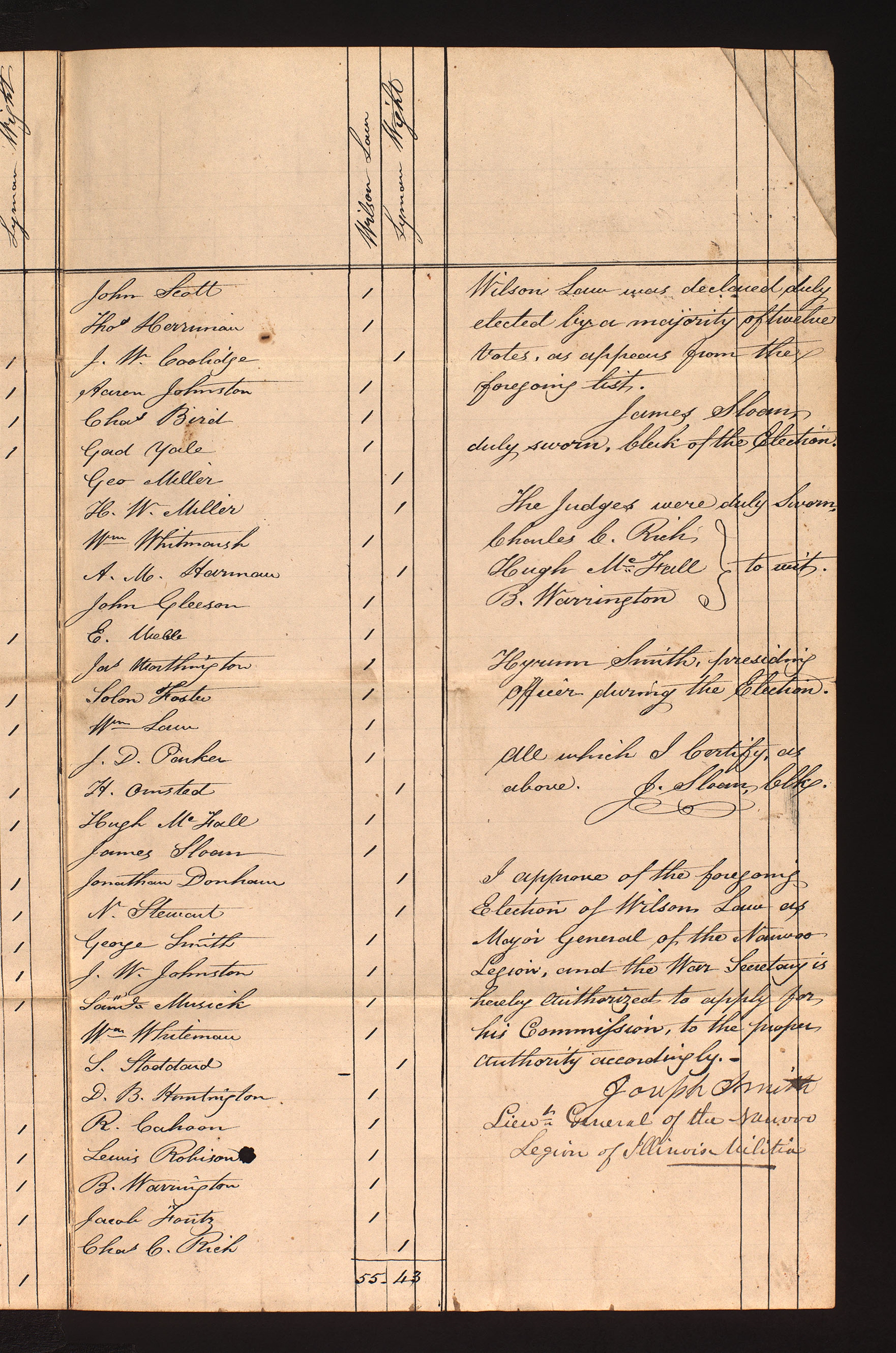 Nauvoo Legion Court-Martial, Poll Record, , Hancock Co., IL, 13 Aug. 1842; handwriting of ; signature of JS; docket in handwriting of ; two pages; Nauvoo Legion Records, CHL. Includes notation.