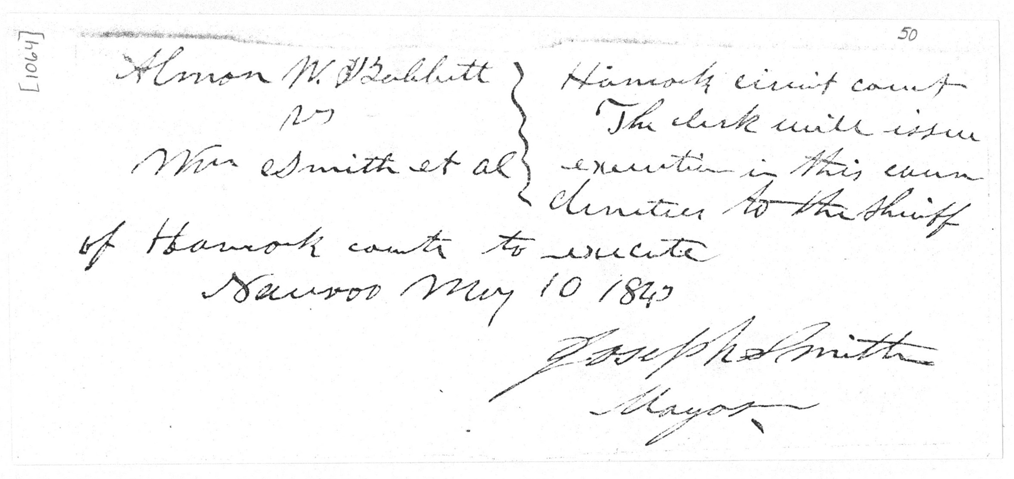 JS as Mayor, Praecipe, to Circuit Court Clerk, , Hancock Co., IL, 10 May 1843, A. Babbitt v. W. Smith et al. (Hancock Co., IL, Circuit Court 1843); unidentified handwriting; one page; private possession.