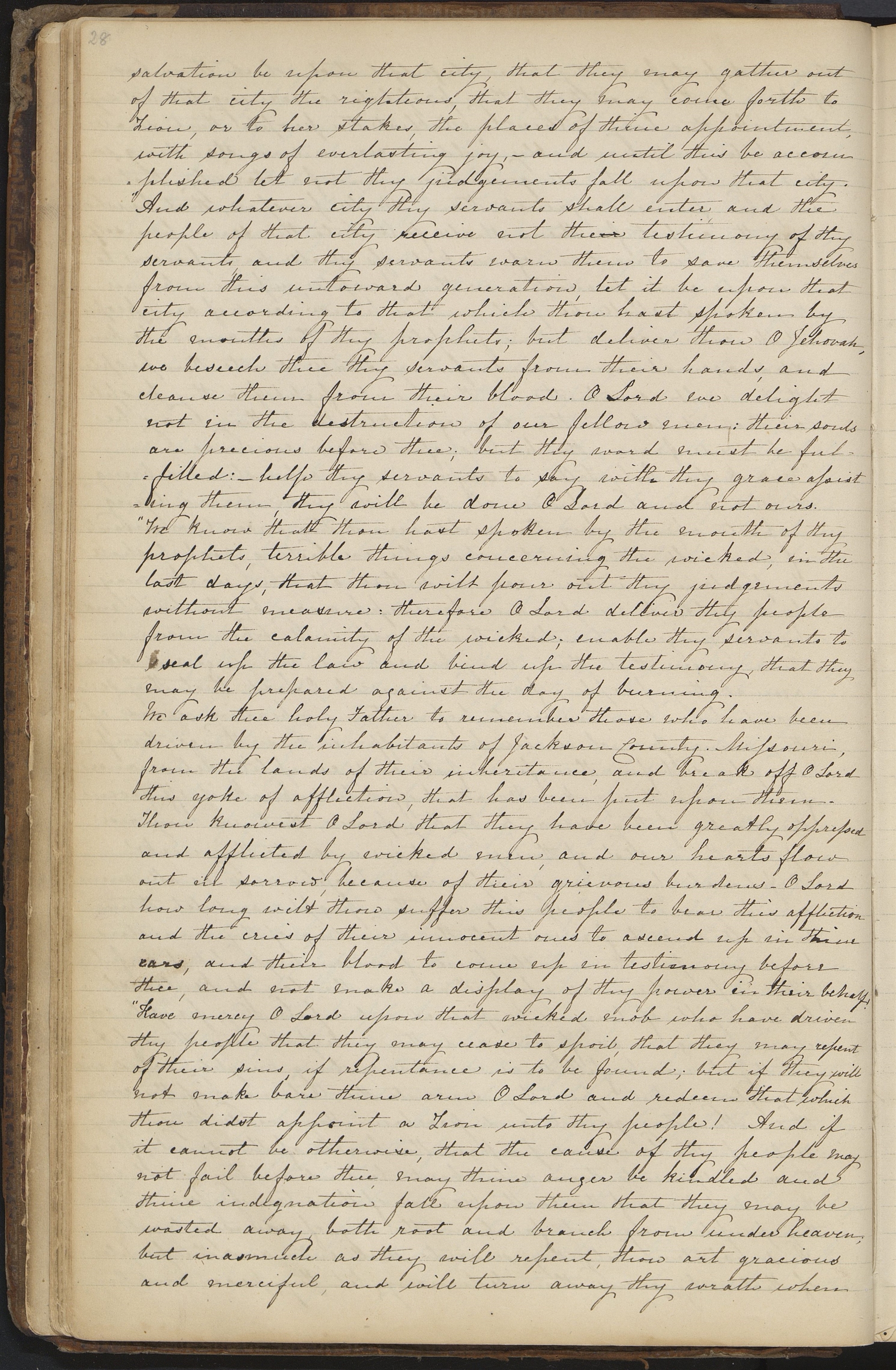 Have mercy O Lord upon that wicked mob who have driven thy people that they may cease to spoil, that they may repent of their sins, if repentance is to be found; but if they will not make bare thine arm O Lord and redeem that which thou didst appoint a Zion unto thy people! And if it cannot be otherwise, that the cause of thy people may not fail before thee, may thine anger be kindled and thine indignation fall upon them that they may be wasted away, both root and branch from under heaven; but inasmuch as they will repent, thou art gracious and merciful, and will turn away thy wrath when [p. 28]