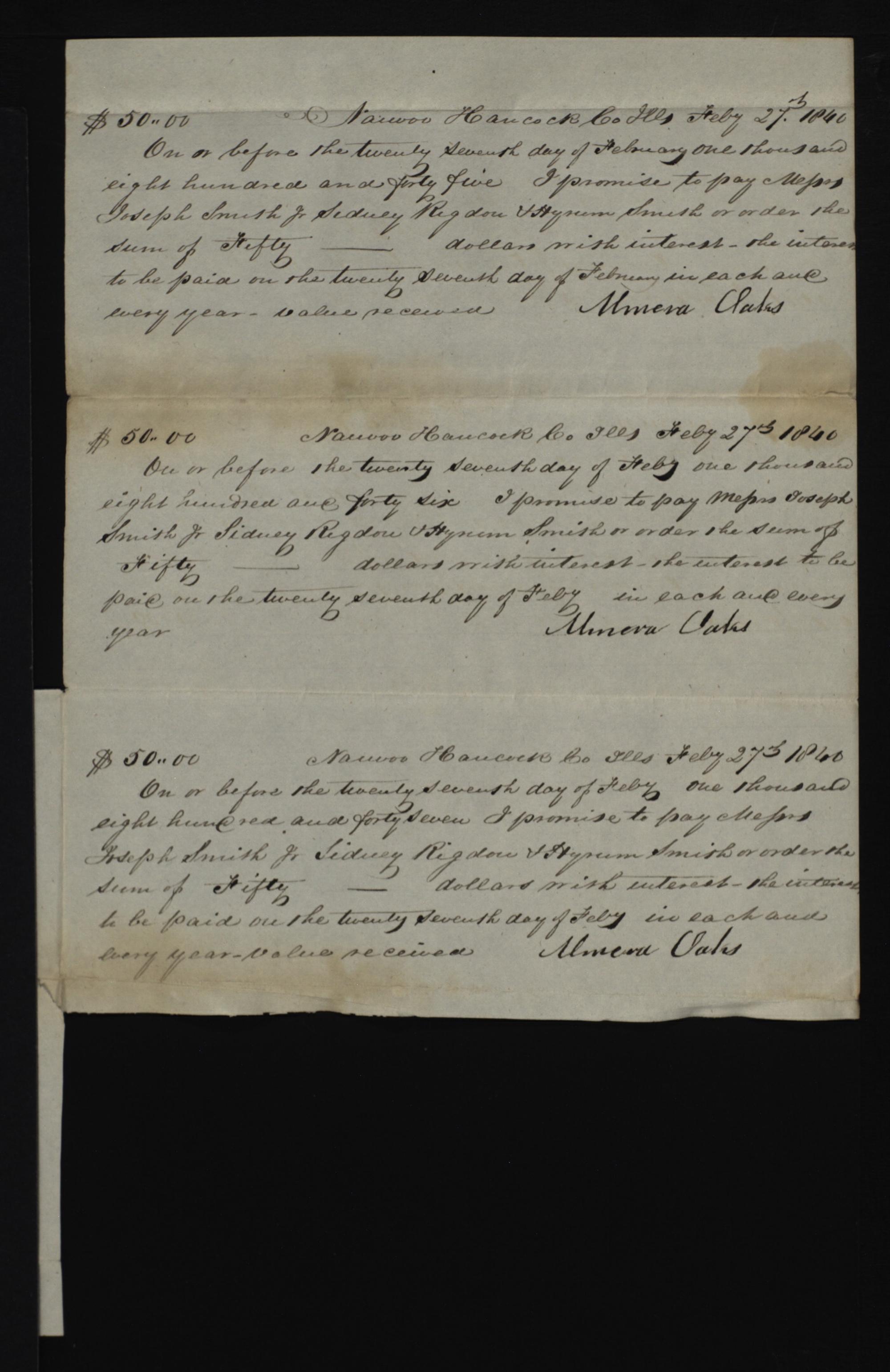 On or before the twenty seventh day of February one thousand eight hundred and forty six I promise to pay Messrs Joseph Smith Jr & or order the sum of Fifty—— dollars with interest the interest to be paid on the twenty seventh day of Feby in each and every year