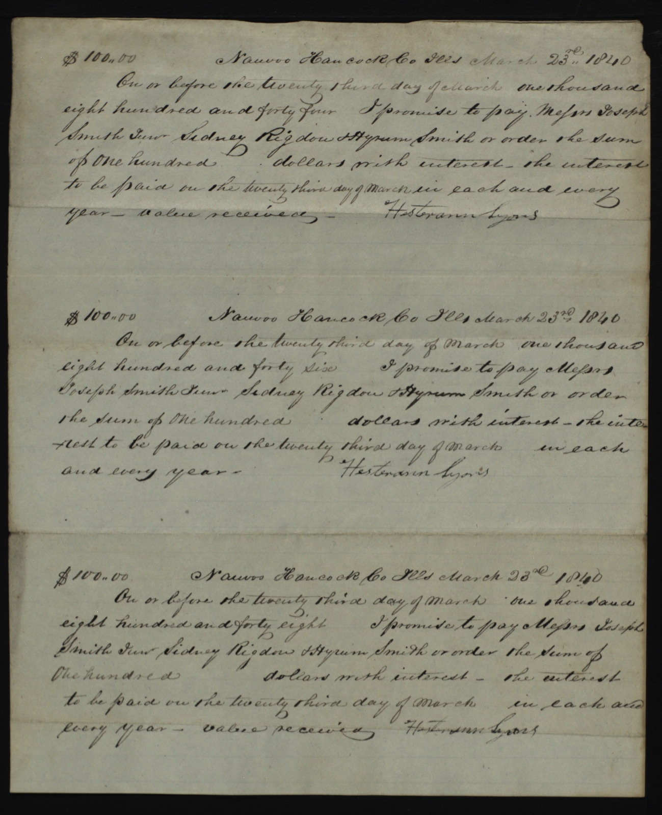 On or before the twenty third day of March one thousand eight hundred and forty six I promise to pay Messrs Joseph Smith Junr & or order the sum of one hundred dollars with interest— the interest to be paid on the twenty third day of March in each and every year