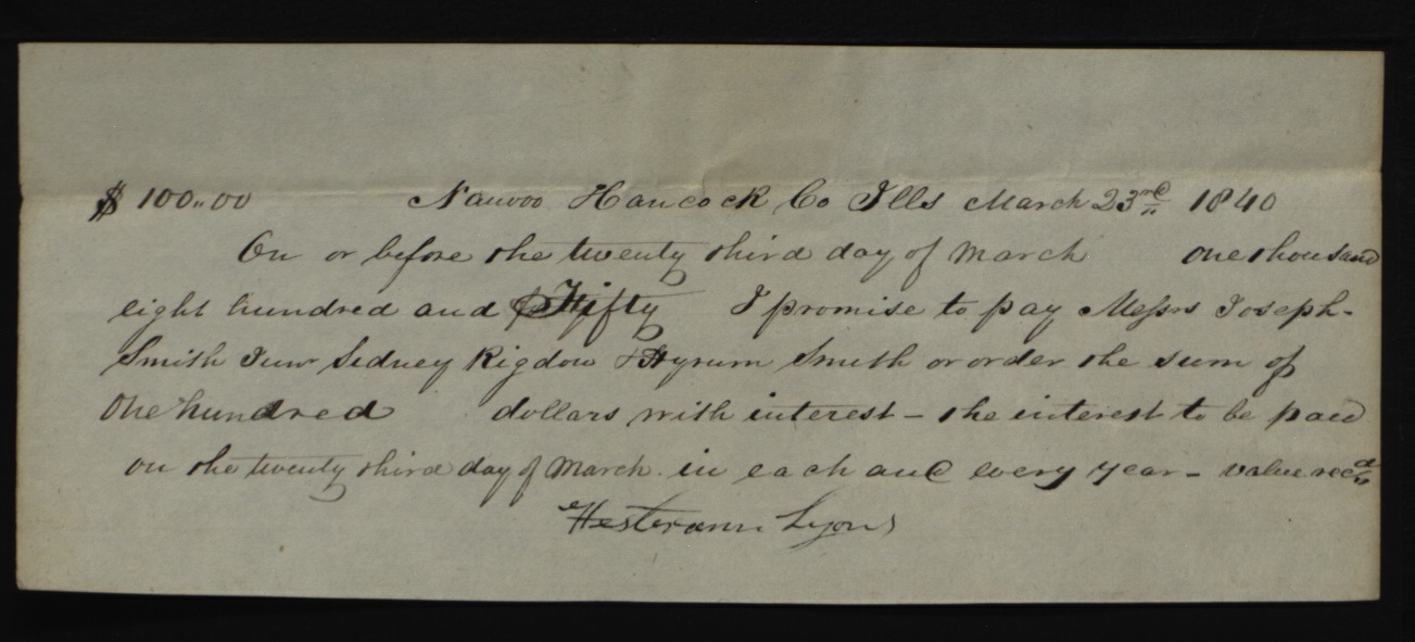 On or before the twenty third day of March one thousand eight hundred and forty Fifty I promise to pay Messrs Joseph— Smith Junr & or order the sum of one hundred dollars with interest— the interest to be paid on the twenty third day of March in each and every year— value recd.