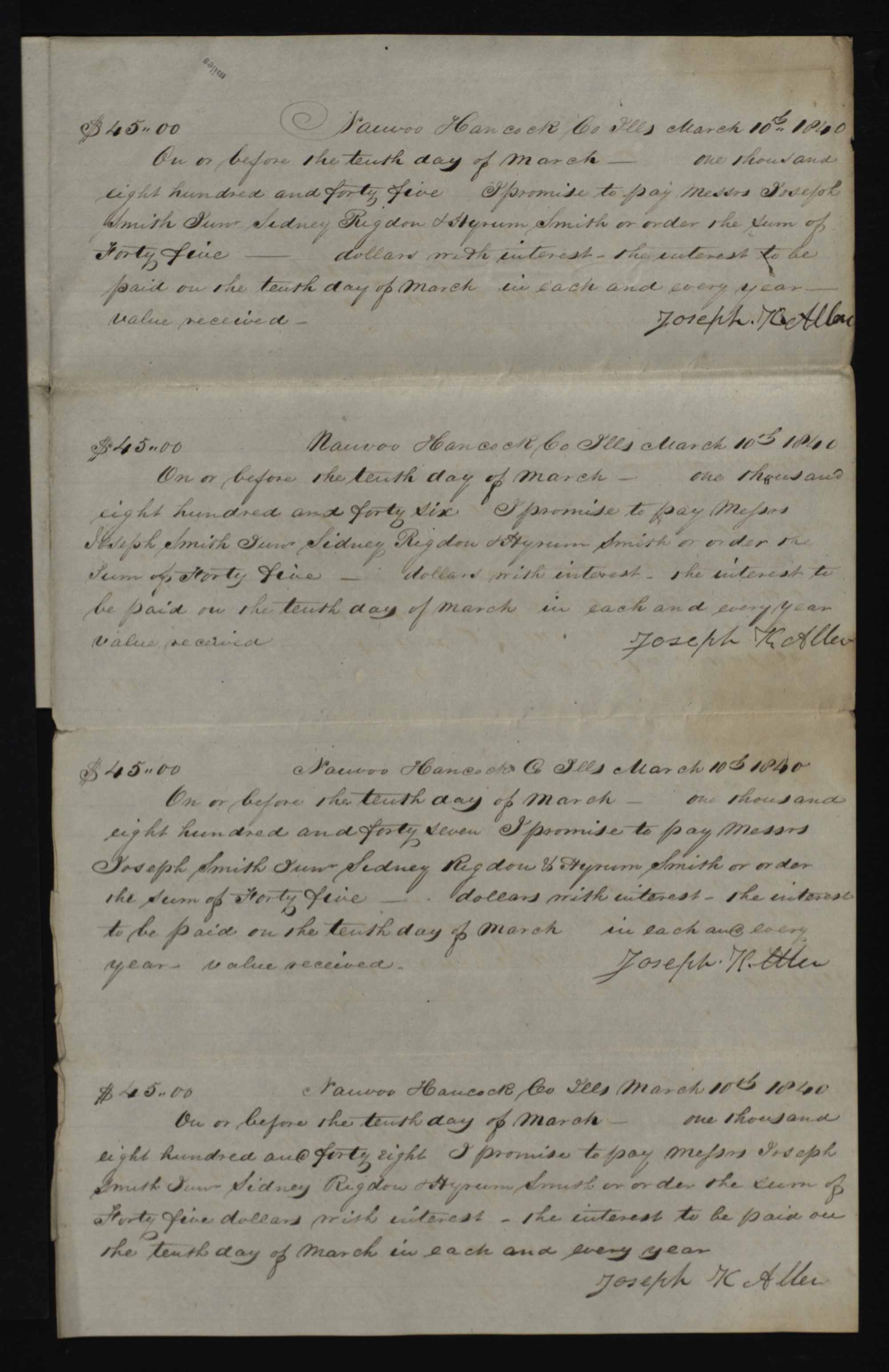 On or before the tenth day of March— one thousand eight hundred and forty six I promise to pay Messrs Joseph Smith Junr & or order the Sum of Forty five— dollars with interest— the interest to be paid on the tenth day of March in each and every year value received