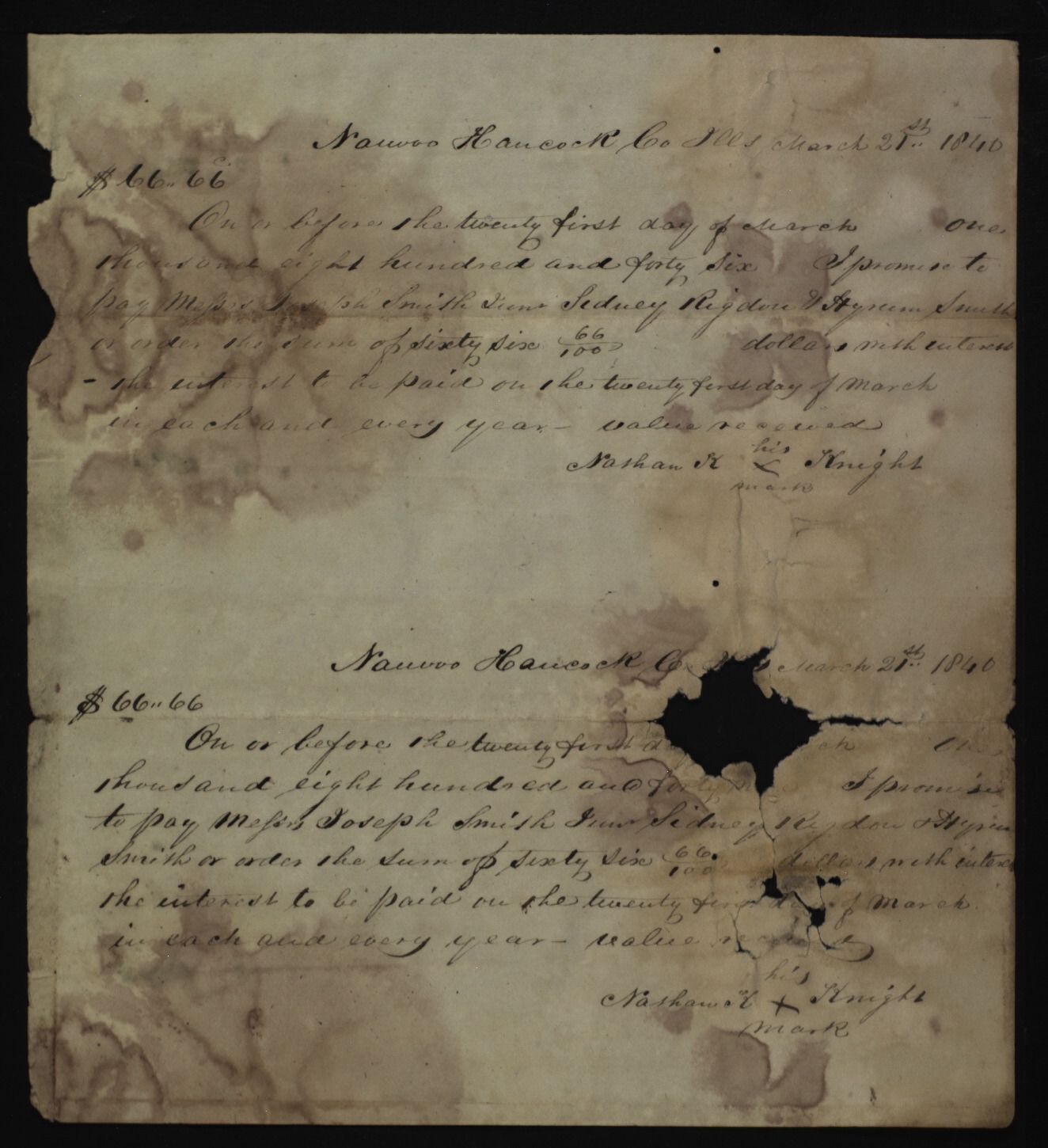 On or before the twenty first day [of Ma]rch one thousand eight hundred and forty n[in]e I promise to pay Messrs Joseph Smith Junr & or order the sum of sixty six 66/100 dollars with interest the interest to be paid on the twenty first day of March in each and every year— value received