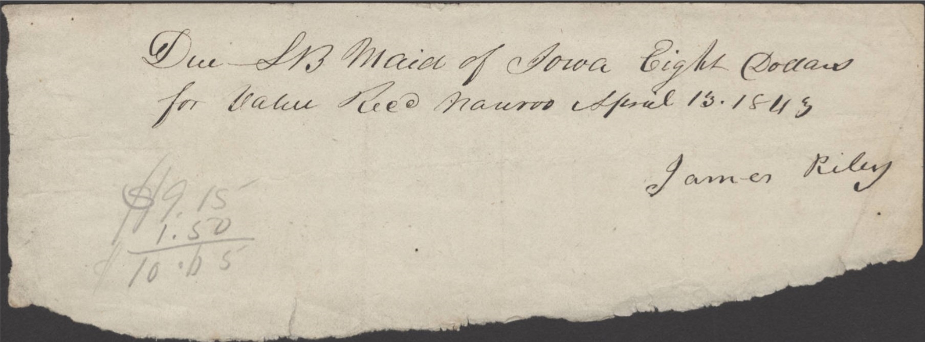 Due SB [Steamboat] Maid of Iowa Eight Dollars for value Rec[eive]d April 13, 1843