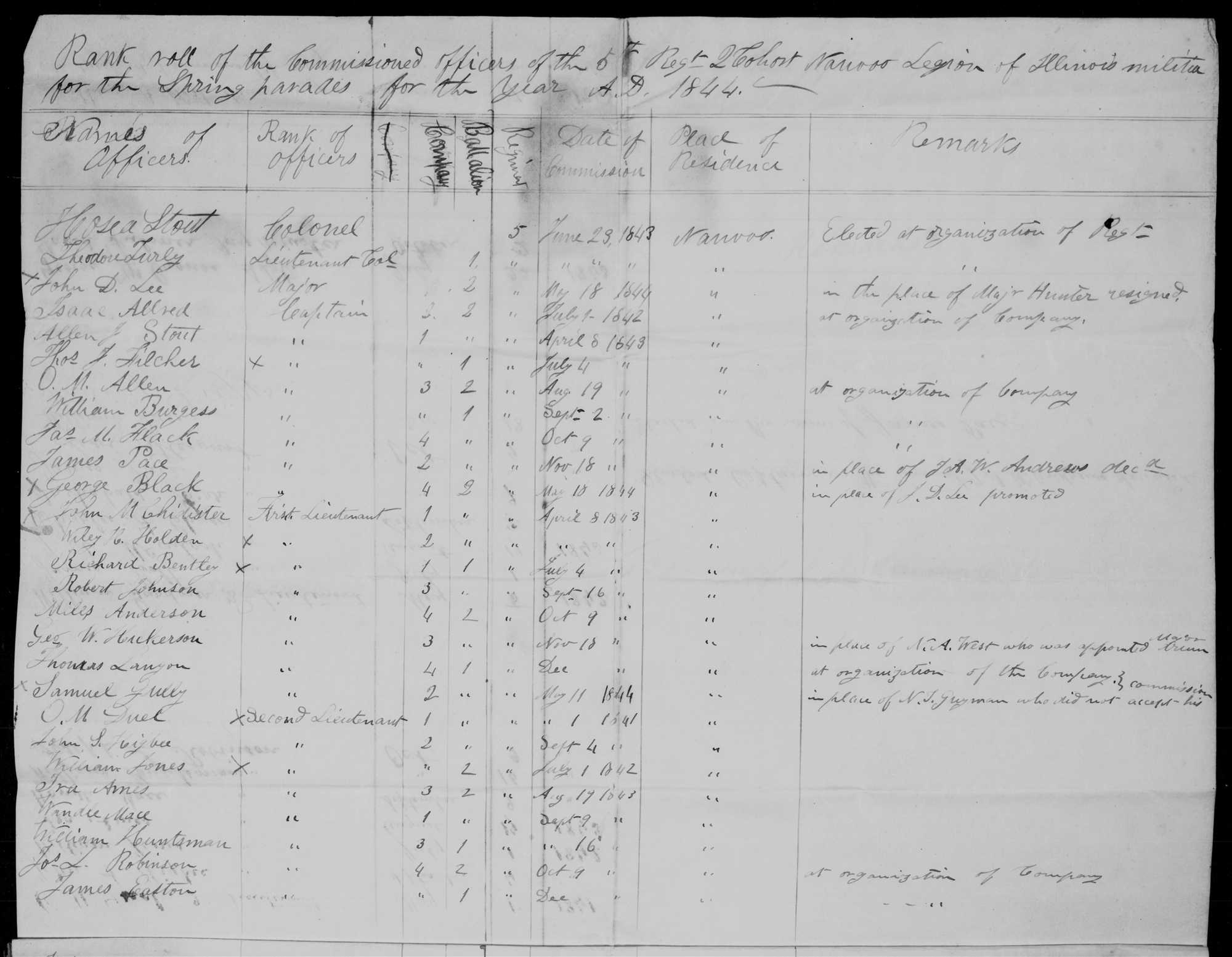 Rank roll of the Commissioned officers of the 5th Regt 2 Cohort of Illinois militia for the Spring parades for the year A.D. 1844.—