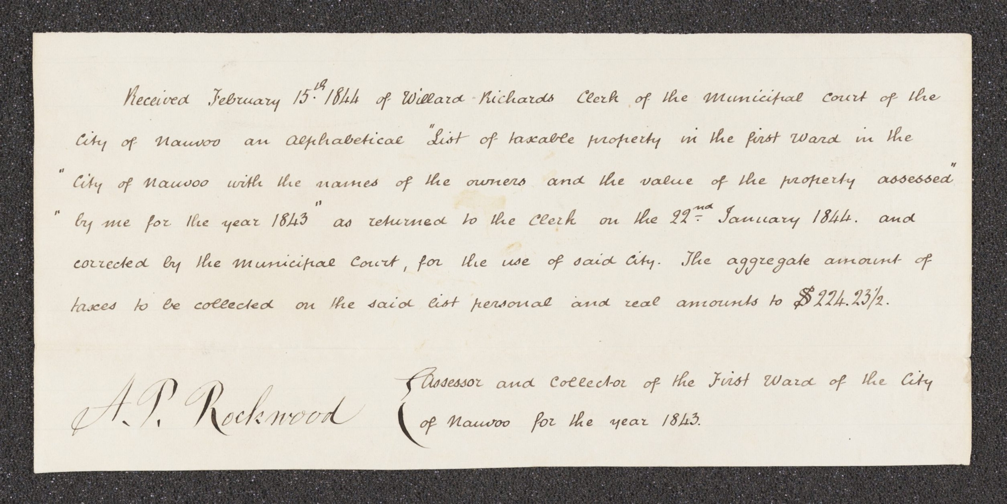 Receipt, Albert P. Rockwood to Willard Richards, 15 February 1844