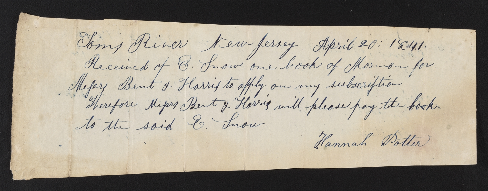 Hannah Potter, Receipt and Pay Order, , Ocean Co., NJ, to and , [agents, on behalf of the Church of Jesus Christ of Latter-day Saints], for , 20 Apr. 1841; handwriting and signature presumably of Hannah Potter; one page; Newel K. Whitney, Papers, BYU. Includes archival marking.