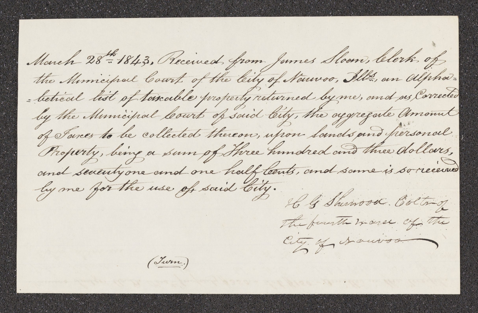 Receipt, Henry G. Sherwood to James Sloan, 28 March 1843
