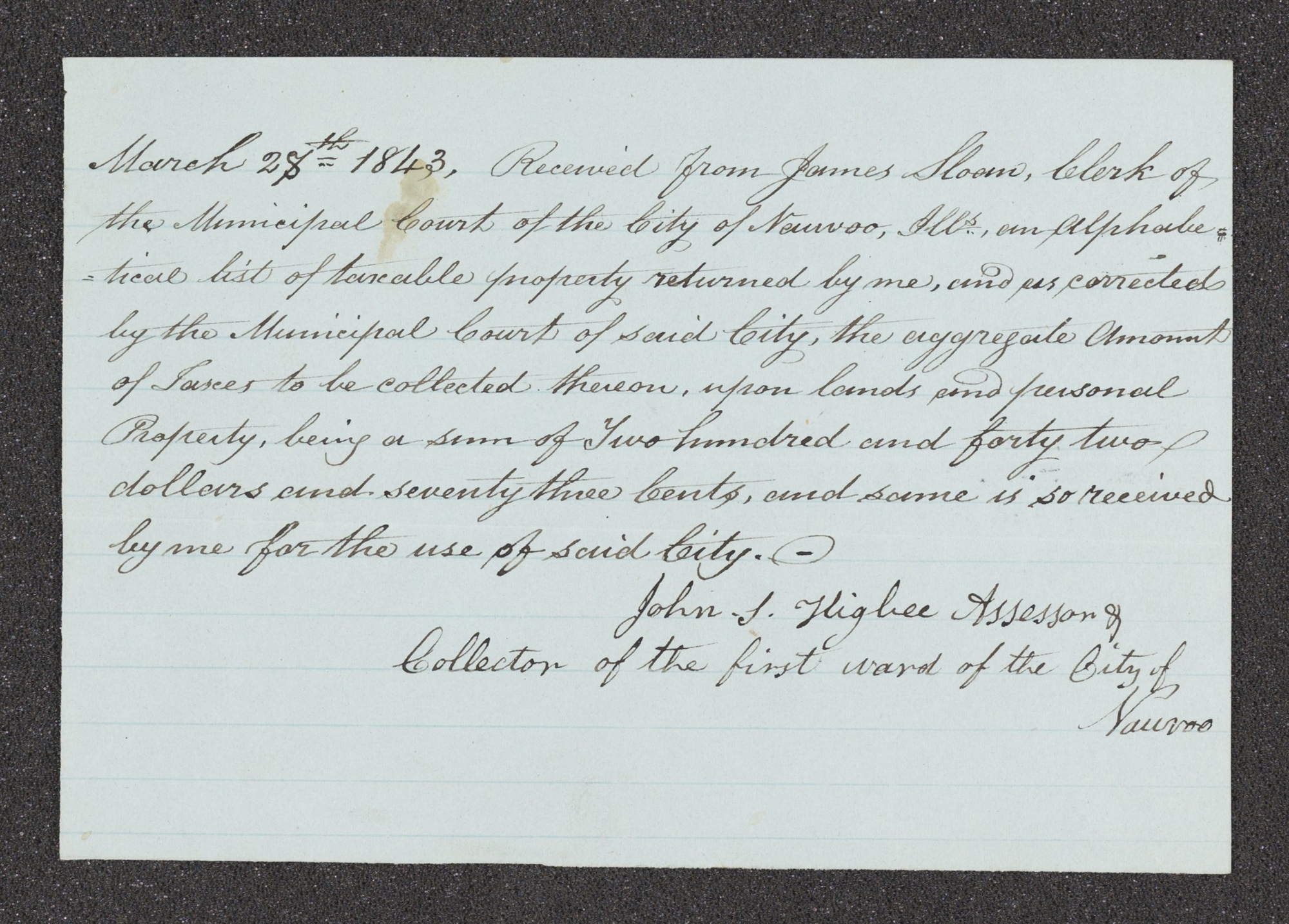 March 28th 1843, Received from , Clerk of the Municipal Court of the City of , Ills, an Alphabetical list of taxable property returned by me, and as corrected by the Municipal Court of said , the aggregate Amount of Taxes to be collected thereon, upon lands and personal Property, being a sum of Two hundred and forty two dollars and seventy three Cents, and same is so received by me for the use of said .—