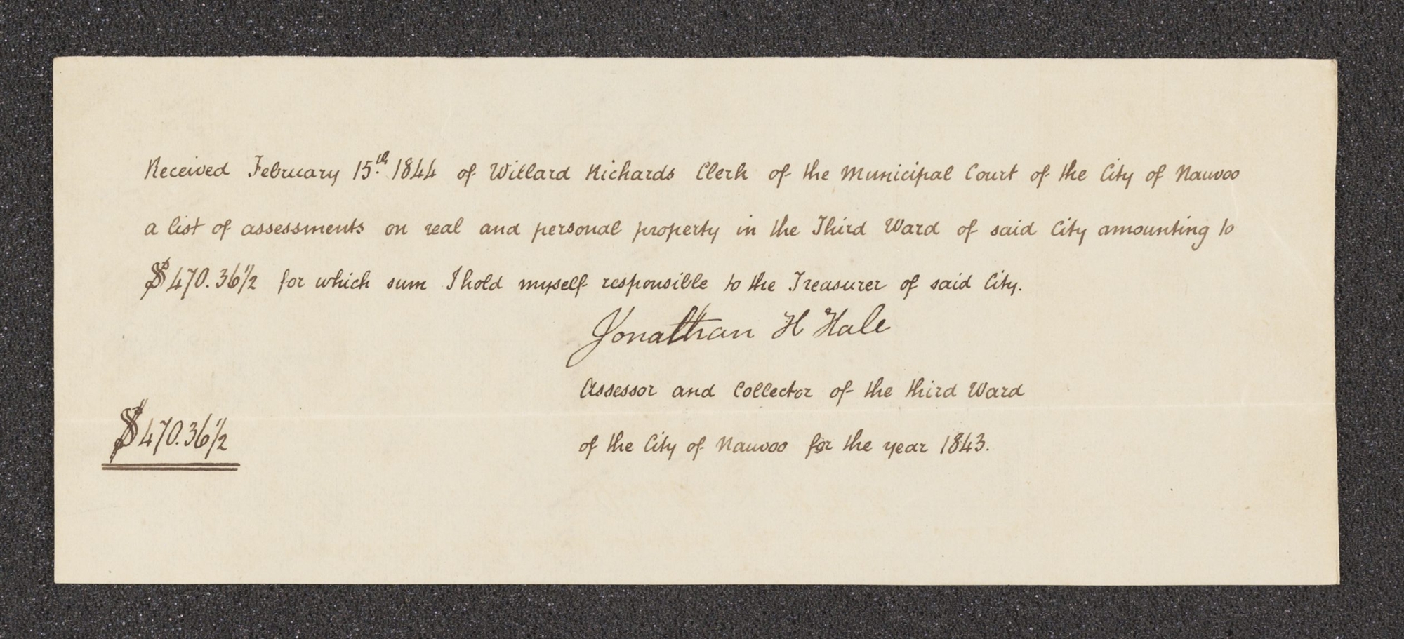 Receipt, Jonathan H. Hale to Willard Richards, 15 February 1844