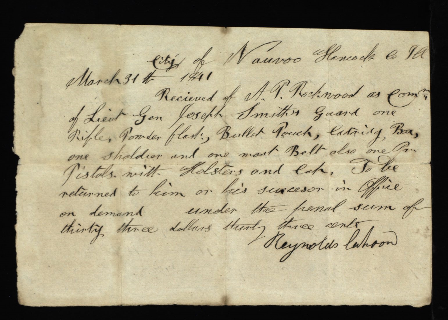 Receipt, Reynolds Cahoon to Albert P. Rockwood, 31 March 1841