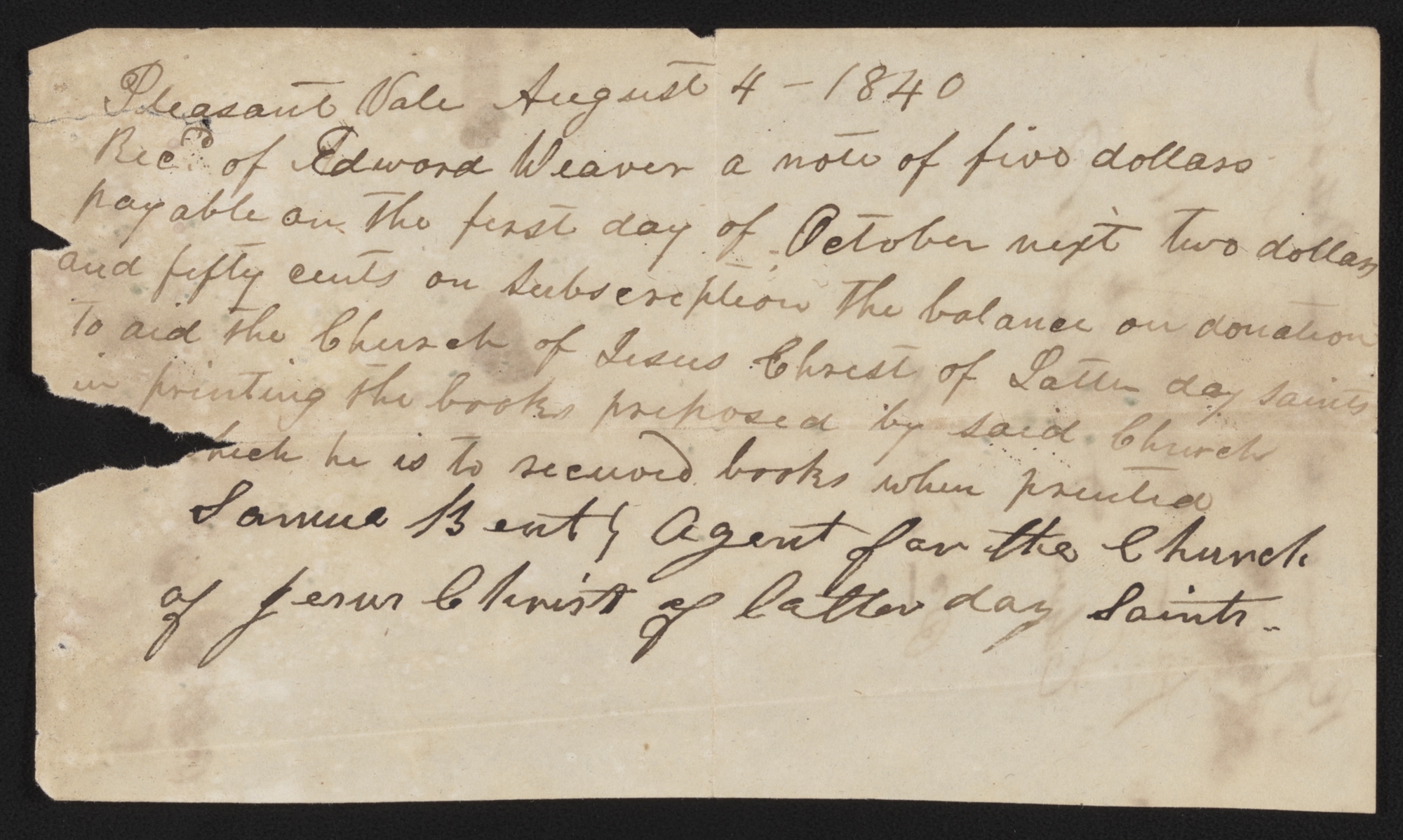 Recd. of Edward Weaver a note of five dollars payable on the first day of October next two dollars and fifty cents on subscription the balance on donation to aid the Church of Jesus Christ of Latter day saints in printing the books preposed by said Church [w]hich he is to received books when printed