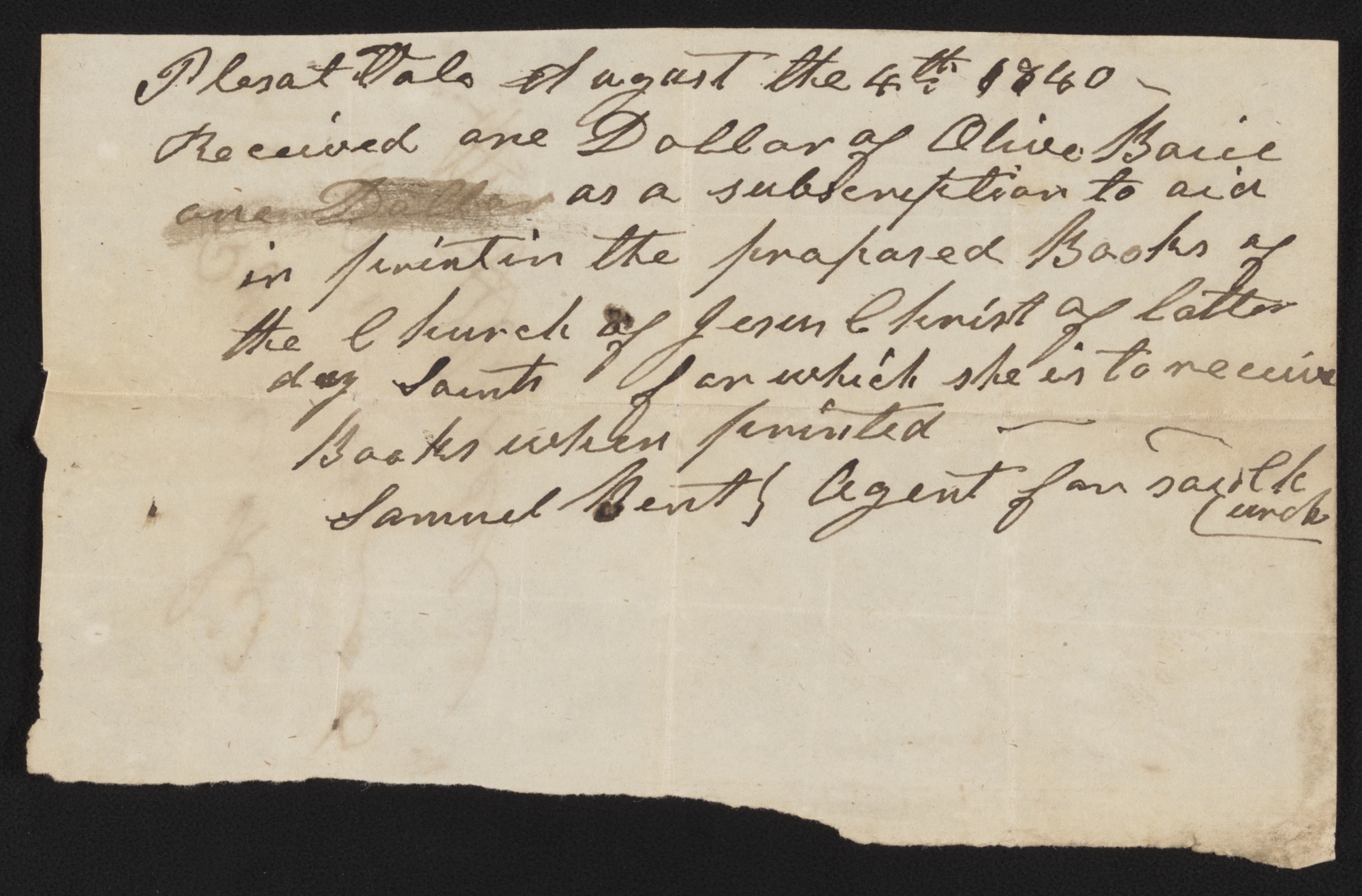 Received one Dollar of Olive Boice [Boyce] one Dollar as a subscription to aid in printin the proposed Books of the Church of Jesus Christ of latter day Saints for which she is to receive Books when printed—