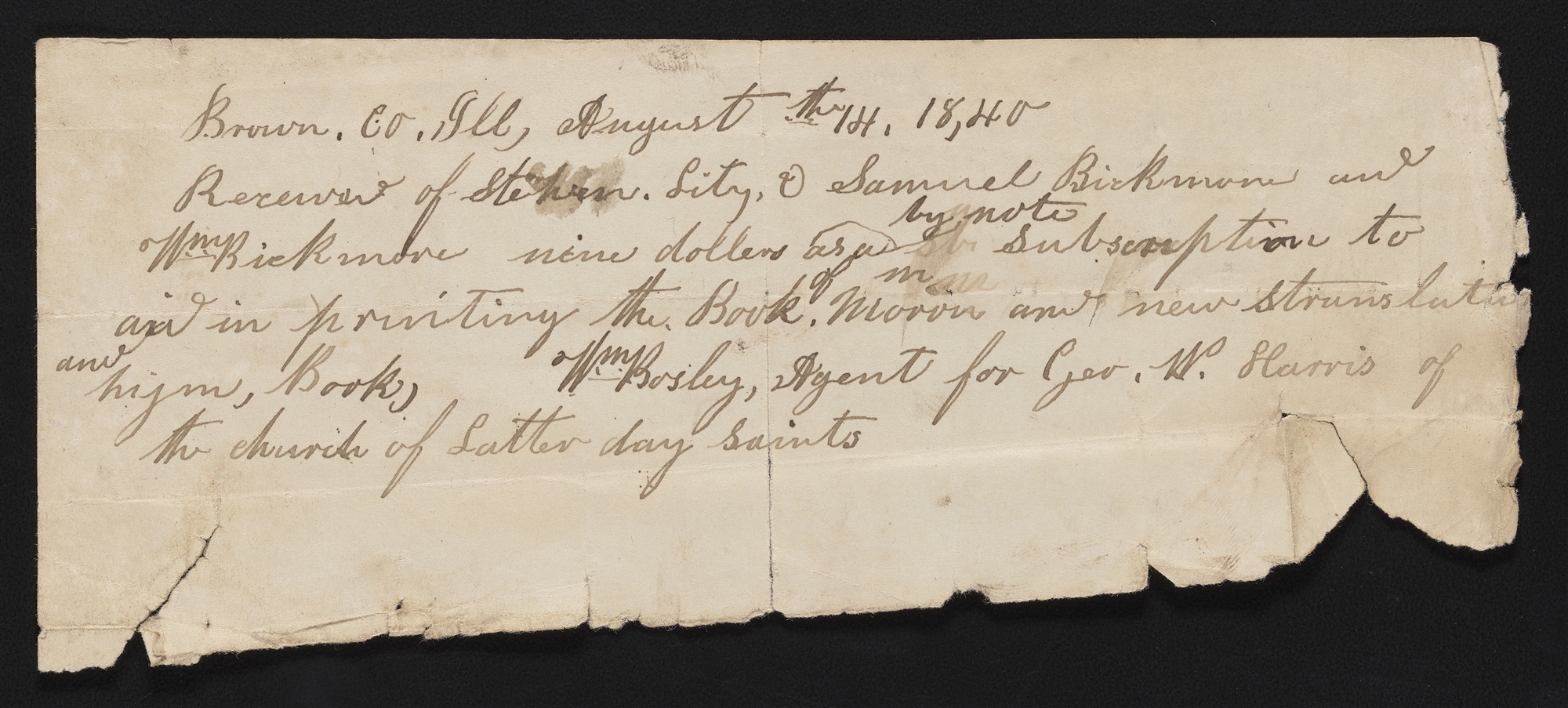 Receipt, William Bosley to Stephen Litz, Samuel Bickmore, and William Bickmore, 14 August 1840