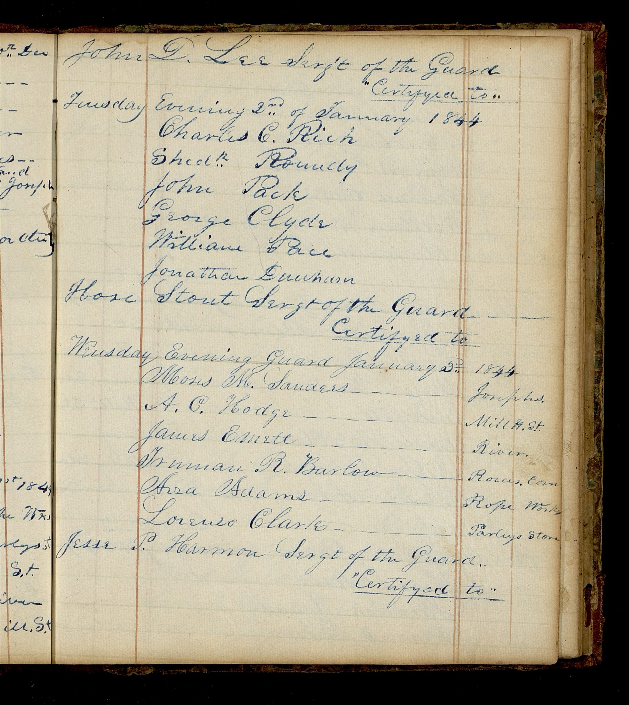 Nauvoo City Police, Record, , Hancock Co., IL, 10 Dec. 1843–13 Jan. 1844. Version copied [ca. Jan. 1844] in Jonathan Dunham, Account Book, 1825–1844, pp. [89]–[96]; handwriting of ; Jonathan Dunham, Papers, 1825–1846, CHL.