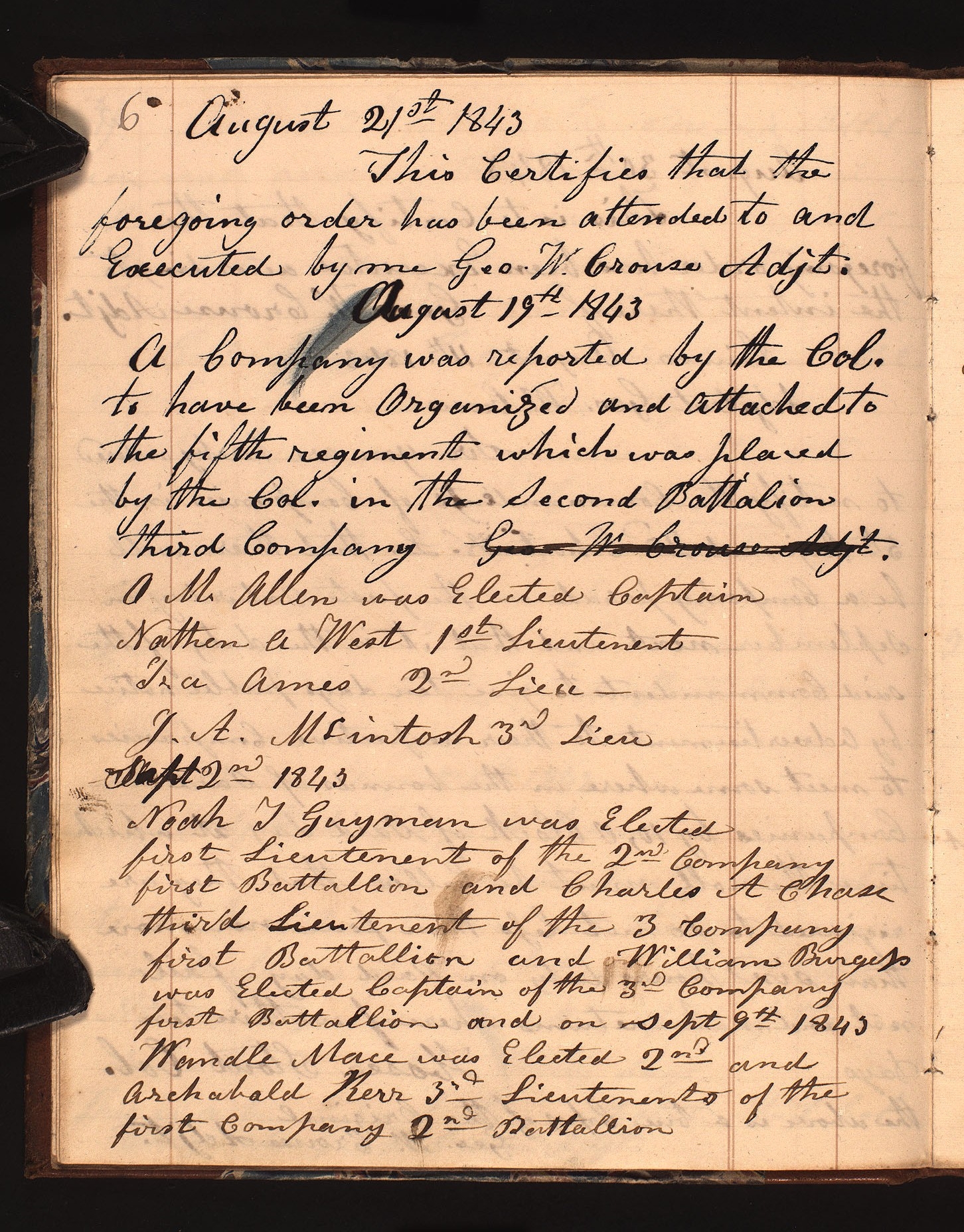 was Elected first Lieutenent of the 2nd Company first Battallion and third Lieutenent of the 3 Company first Battallion and was Elected Captain of the 3rd Company first Battallion and on Sept 9th 1843 Wandle Mace was Elected 2nd and 3rd Lieutenents of the first Company 2nd Battallion [p. 6]