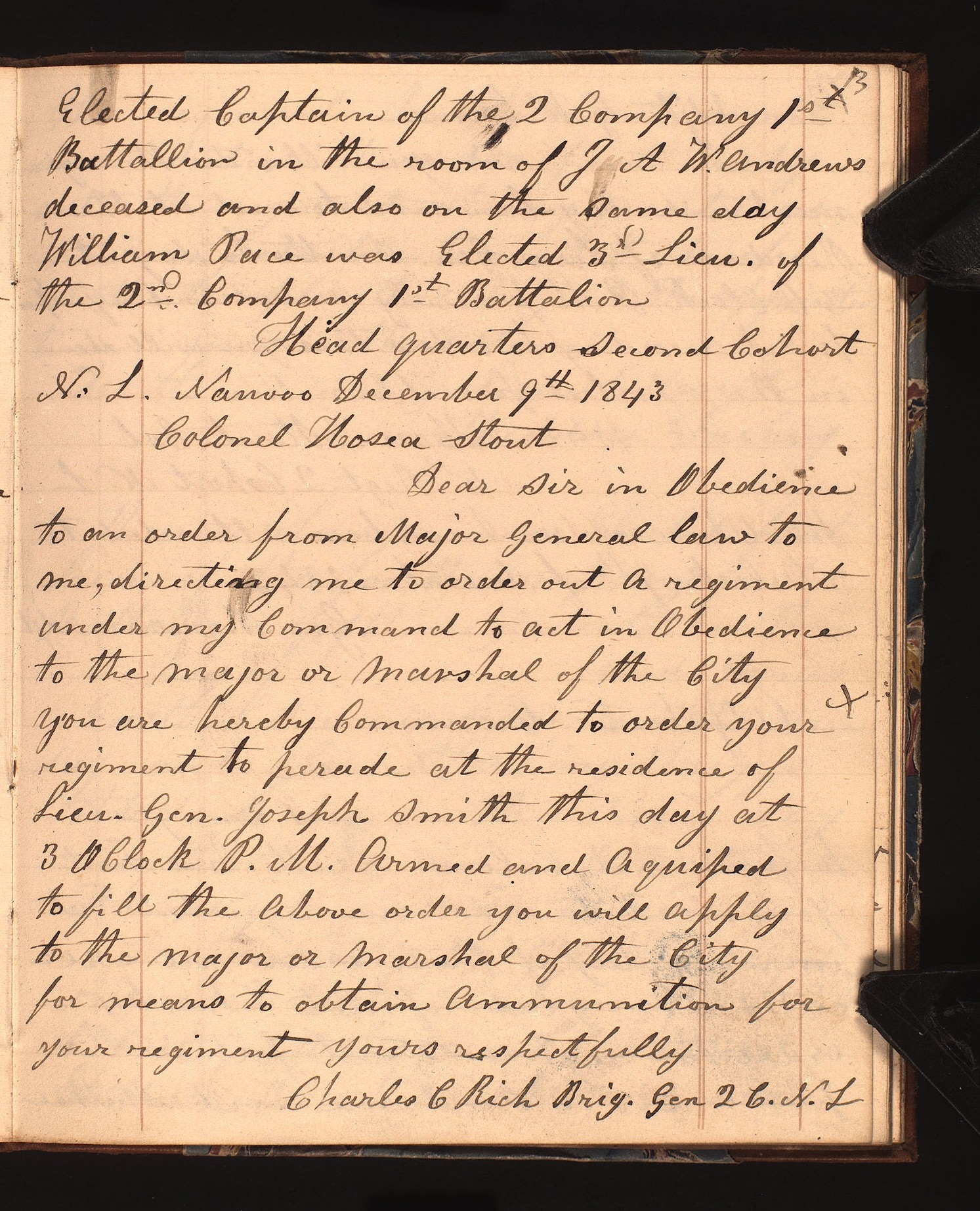 Dear Sir in Obedience to an order from to me, directing me to order out a regiment under my Command to act in Obedience to the Major or Marshal of the y’ou are hereby Commanded to order your regiment to perade at the residence of Lieu. Gen. Joseph Smith this day at 3 O Clock P. M. Armed and Aquiped to fill the Above order you will apply to the Major or Marshal of the for means to obtain Ammunition for your regiment yours respectfully