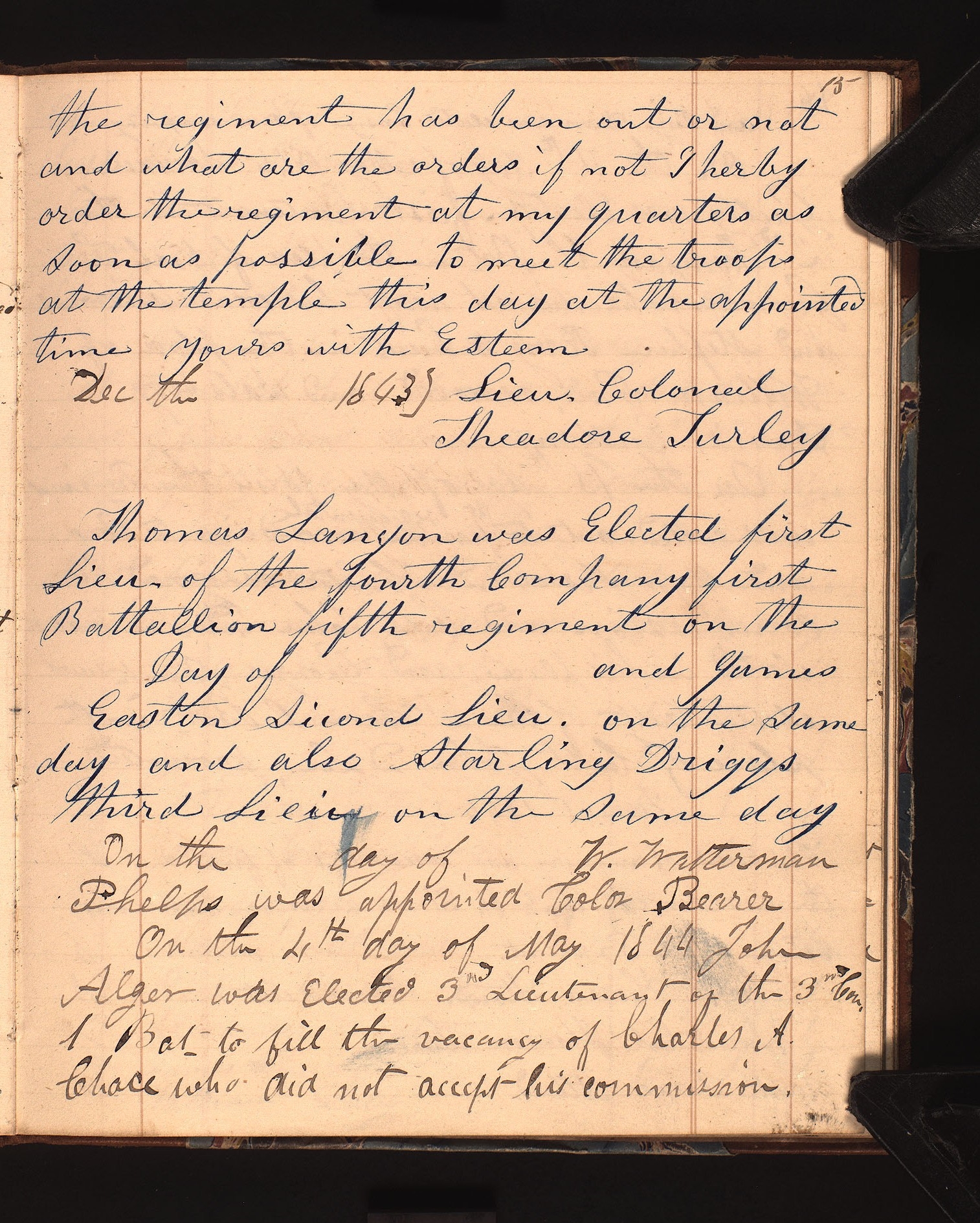 On the 4th day of May 1844 John Alger was Elected 3rd Lieutenant of the 3rd Com. 1 Bat to fill the vacancy of who did not accept his commission, [p. 15]