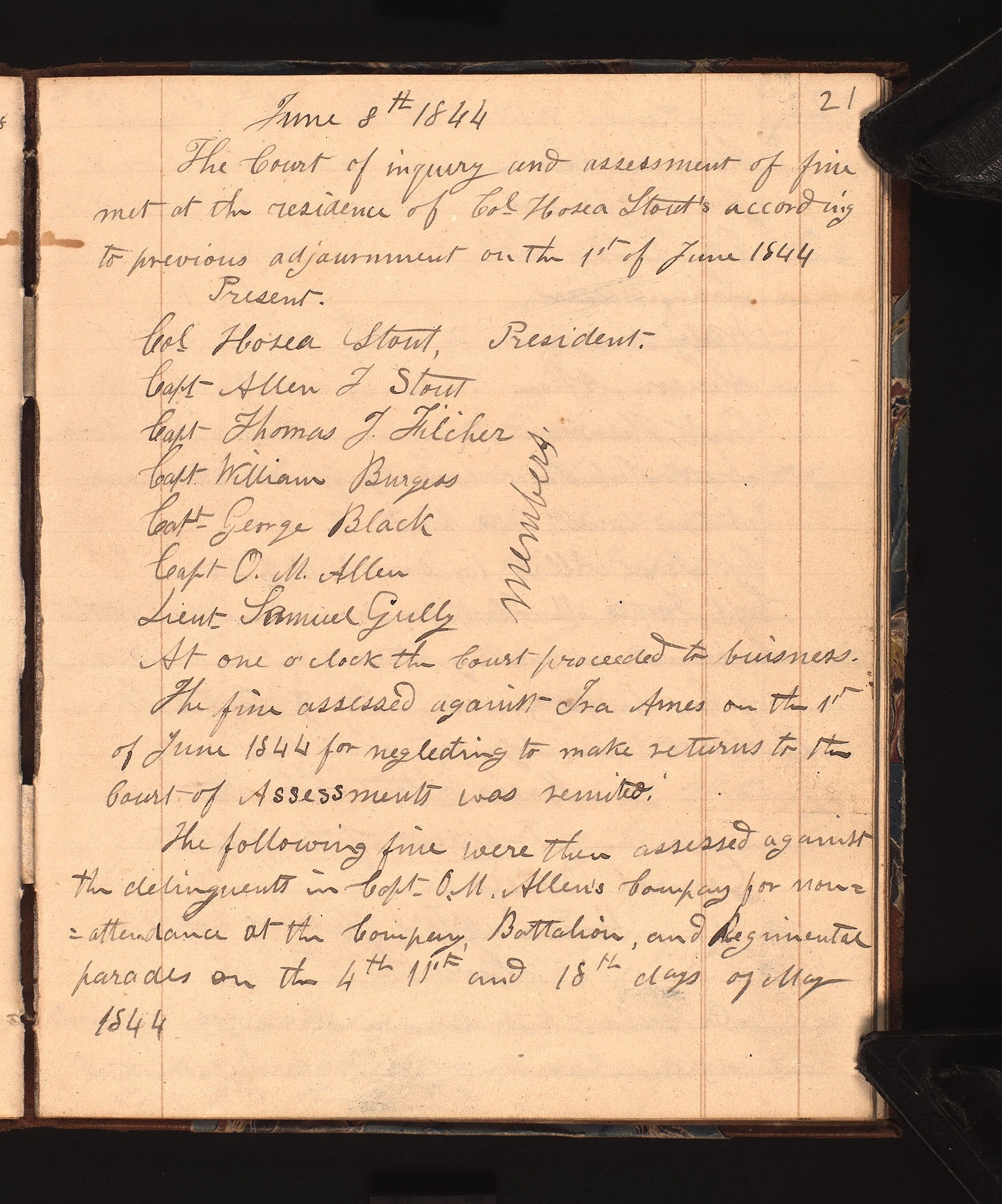 The following fine were then assessed against the delinquents in Capt ’s Compa[n]y for nonattendance at the Compay, Battalion, and Regimental parades on the 4th 11st and 18th days of May 1844 [p. 21]