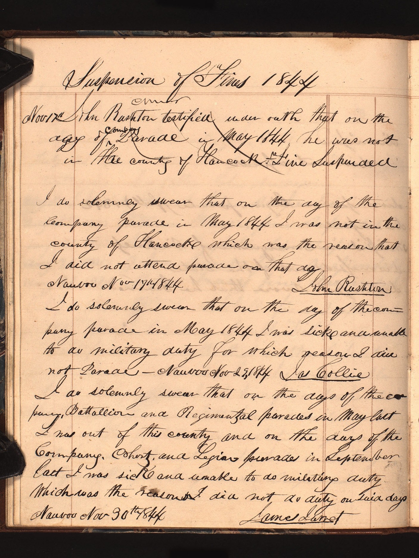 Record of Second Cohort, [, Hancock Co., IL], 10 June 1843–3 Dec. 1844; handwriting of George W. Crouse, , unidentified scribe, and W. Waterman Phelps; thirty-three pages; Nauvoo Legion Records, CHL.