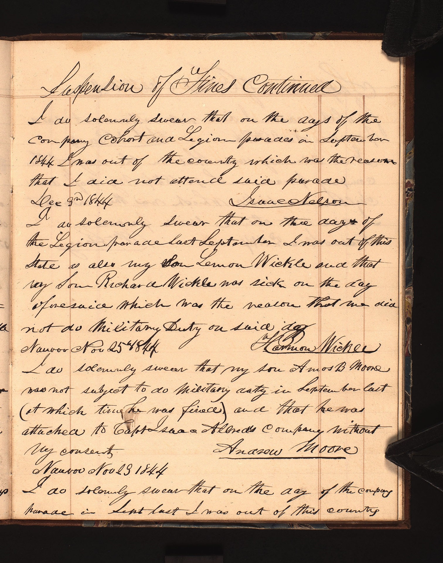 Record of Second Cohort, [, Hancock Co., IL], 10 June 1843–3 Dec. 1844; handwriting of George W. Crouse, , unidentified scribe, and W. Waterman Phelps; thirty-three pages; Nauvoo Legion Records, CHL.