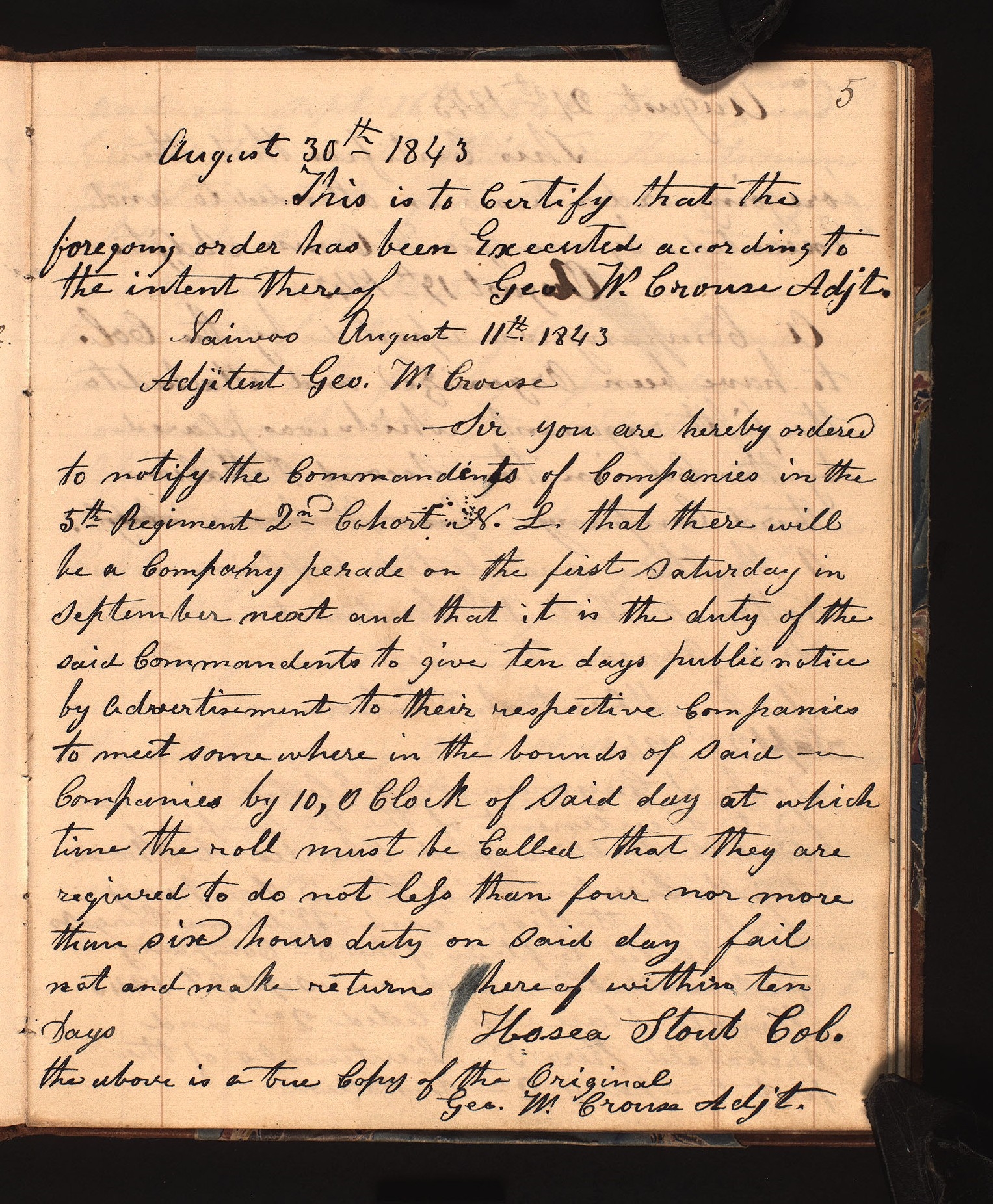 Record of Second Cohort, [, Hancock Co., IL], 10 June 1843–3 Dec. 1844; handwriting of George W. Crouse, , unidentified scribe, and W. Waterman Phelps; thirty-three pages; Nauvoo Legion Records, CHL.