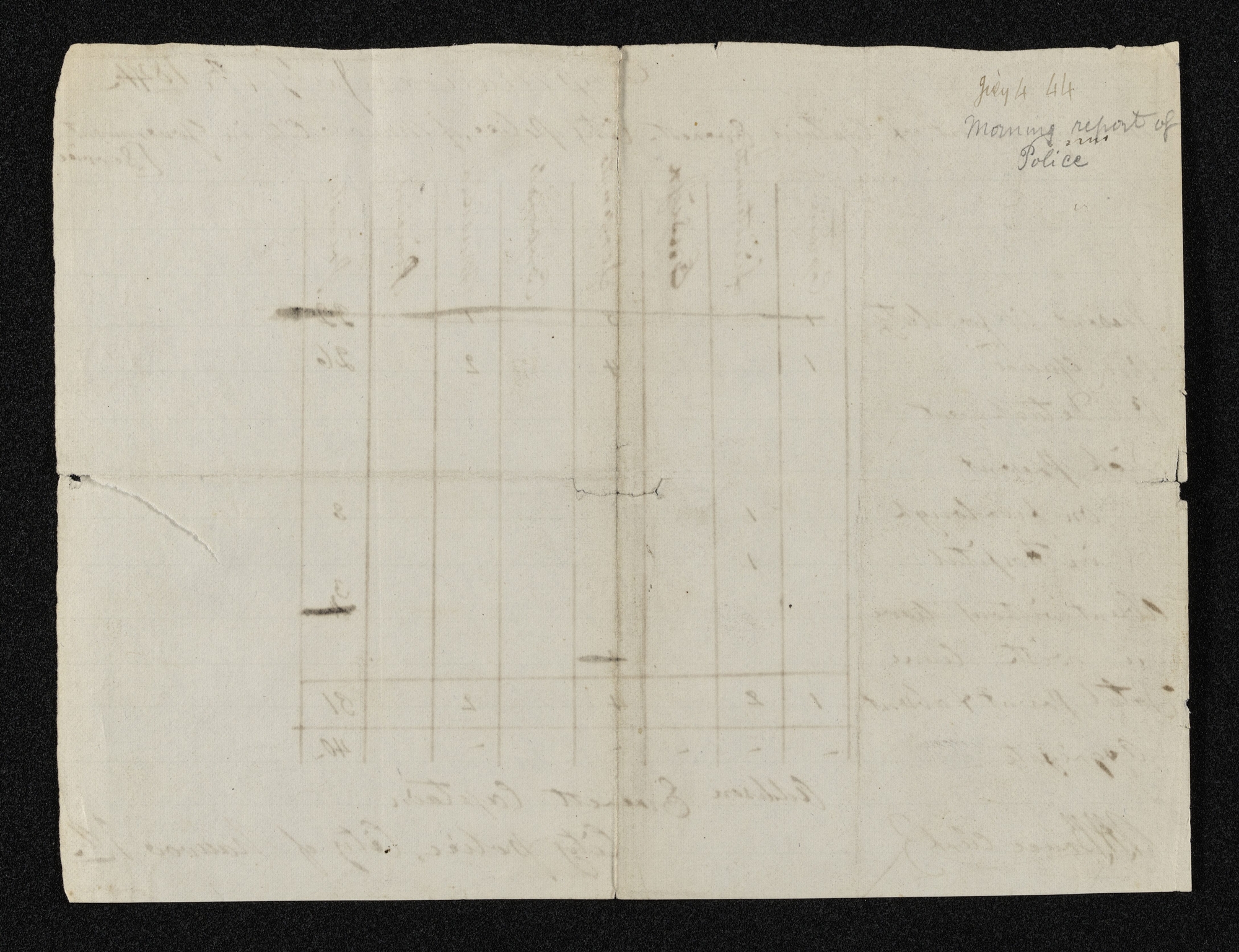 , Morning Report of Nauvoo City Police, , Hancock Co., IL, 4 July 1844; handwriting of ; dockets in handwriting of and unidentified scribe; one page; Nauvoo Police Reports, CHL.