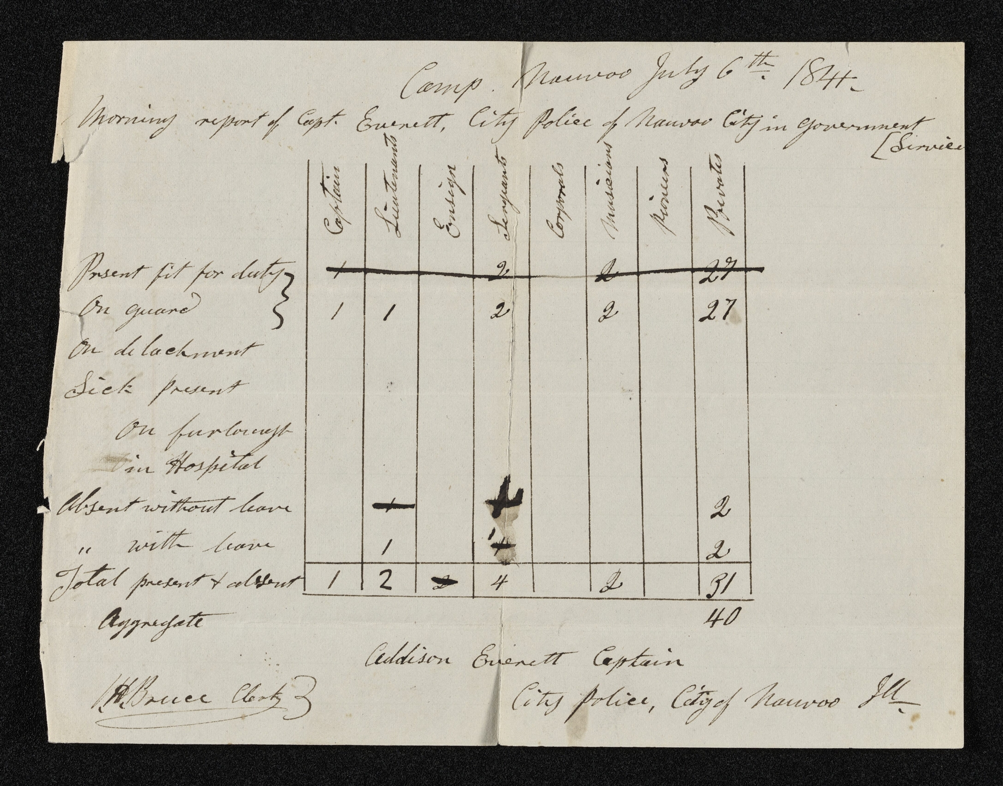, Morning Report of Nauvoo City Police, , Hancock Co., IL, 6 July 1844; handwriting of ; dockets in handwriting of and ; one page; Nauvoo Police Reports, CHL.