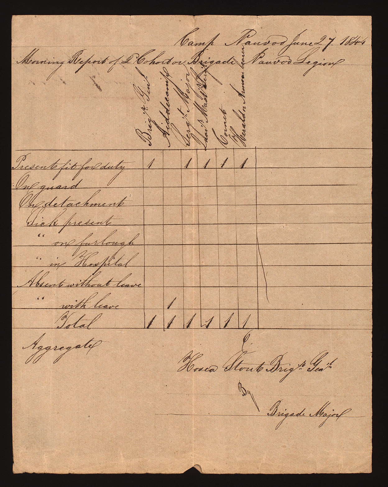 , Morning Report from Second Cohort, , Hancock Co., IL, 27 June 1844; unidentified handwriting; docket in unidentified handwriting; one page; Nauvoo Legion Records, CHL.