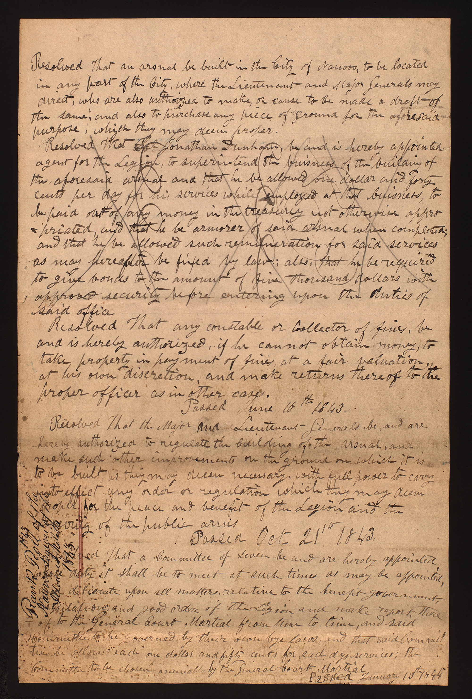 Resolved That the Major and Lieutenant Generals be, and are hereby authorized to regulate the building of the arsnal, and make such other improvements on the ground on which it is to be built, as they may deem necessary, with full power to carry into effect any order or regulation which they may deem proper for the peace and benefit of the Legion and the security of the public arms