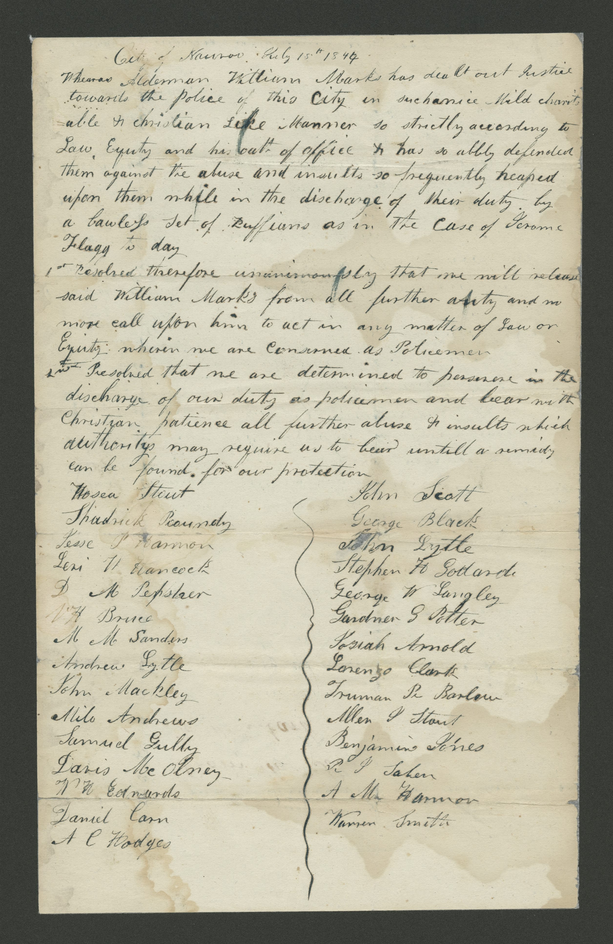 and 28 others [Nauvoo City Police], Resolutions, , Hancock Co., IL, to , 15 July 1844; unidentified handwriting; docket in unidentified handwriting; one page; Nauvoo, IL, Records, 1841–1845, CHL.