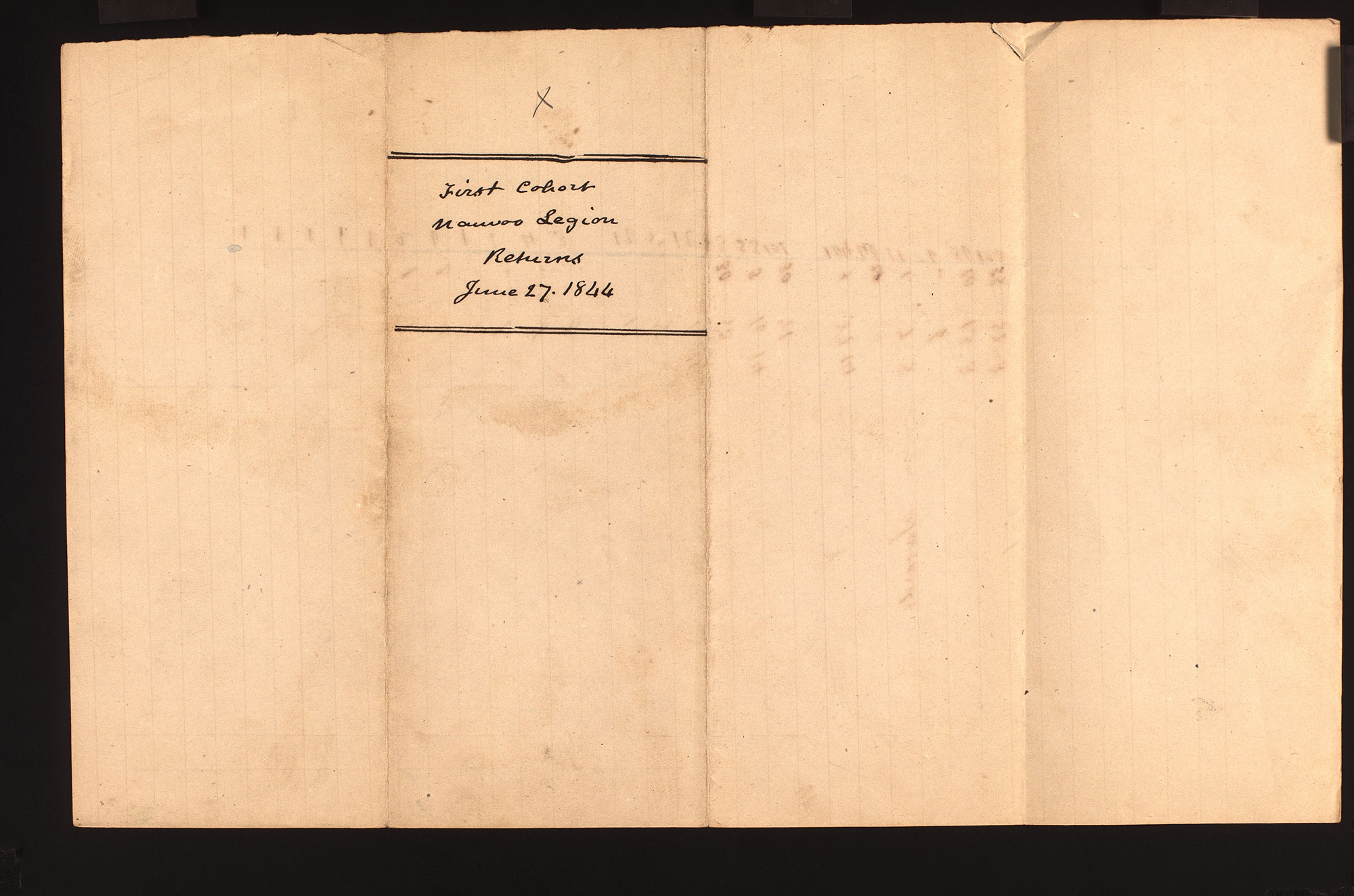 , Return from First Cohort, , Hancock Co., IL, 27 June 1844; handwriting of with insertions in unidentified handwriting; signature of ; docket in handwriting of ; one page; Nauvoo Legion Records, CHL.