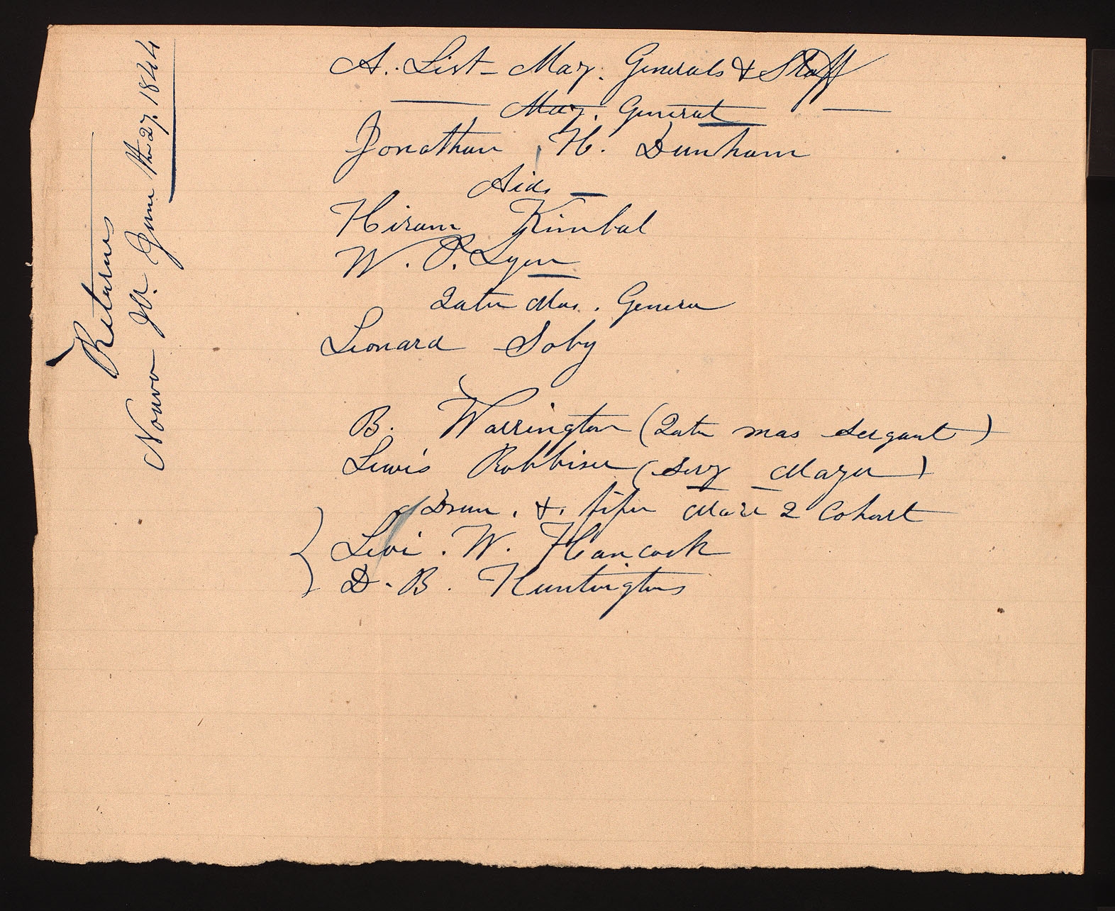Return from Major General’s Staff, , Hancock Co., IL, 27 June 1844; unidentified handwriting; docket in handwriting of ; one page; Nauvoo Legion Records, CHL.