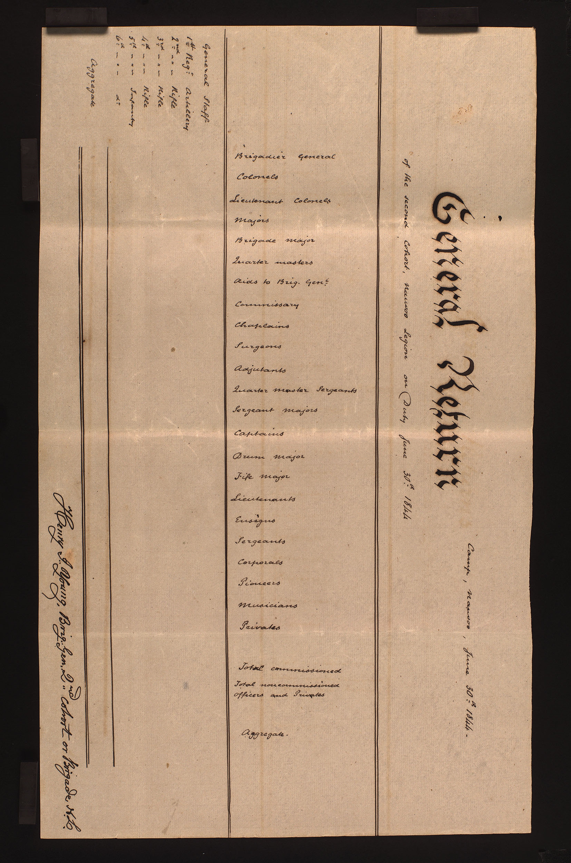 | Brigadier General | Colonels | Lieutenant Colonels | Majors | Brigade Major | Quarter masters | Aids to Brig. Genl. | Commissary | Chaplains | Surgeons | Adjutants | Quarter Master Sergeants | Sergeant Majors | Captains | Drum Major | Fife Major | Lieutenants | Ensigns | Sergeants | Corporals | Pioneers | Musicians | Privates | Total commissioned | Total noncommissioned Officers and Privates | Aggregate. | |