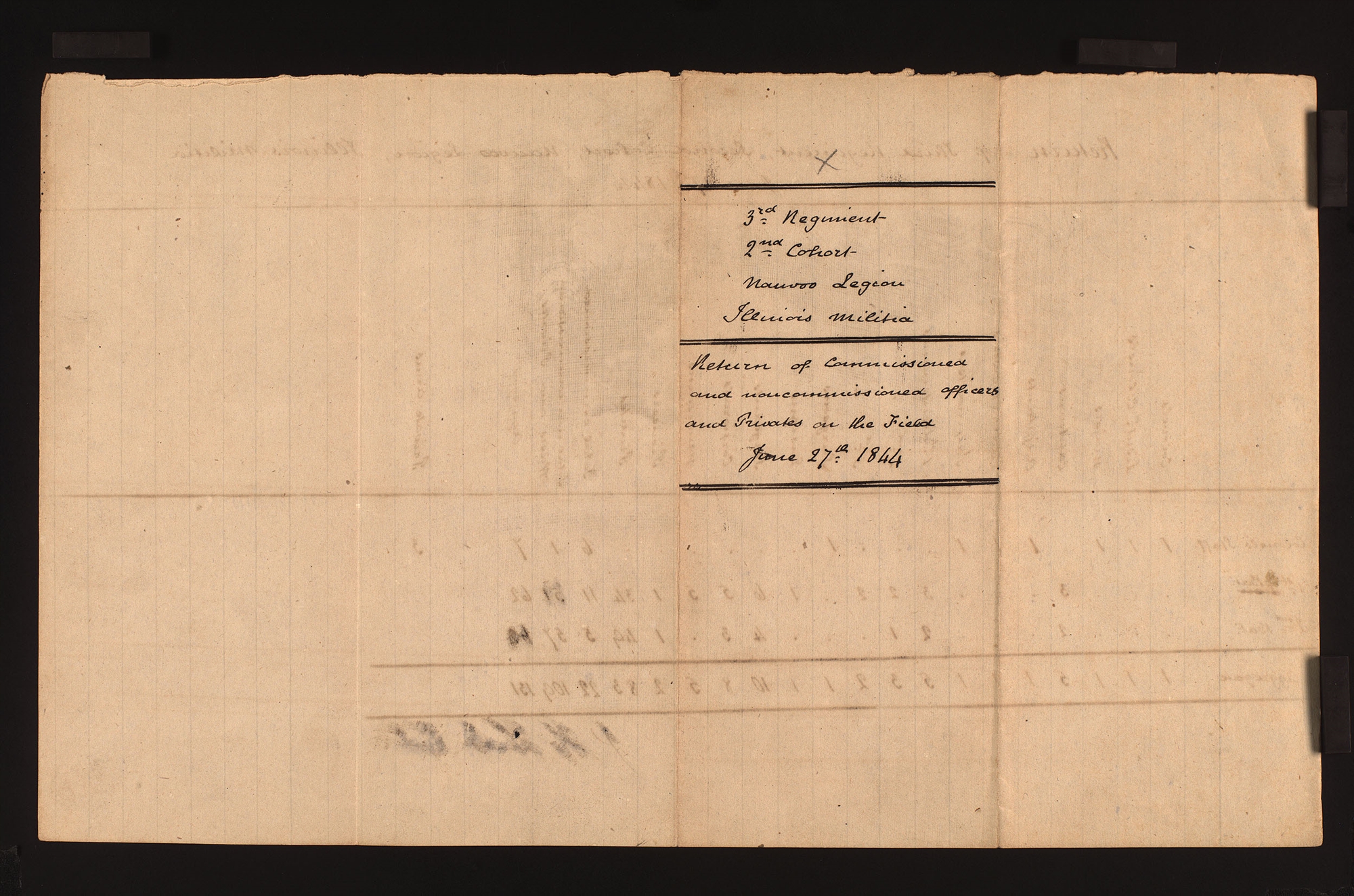 Return from Third Regiment, Second Cohort, , Hancock Co., IL, 27 June 1844; handwriting of ; canceled signature of ; docket in handwriting of ; one page; Nauvoo Legion Records, CHL.