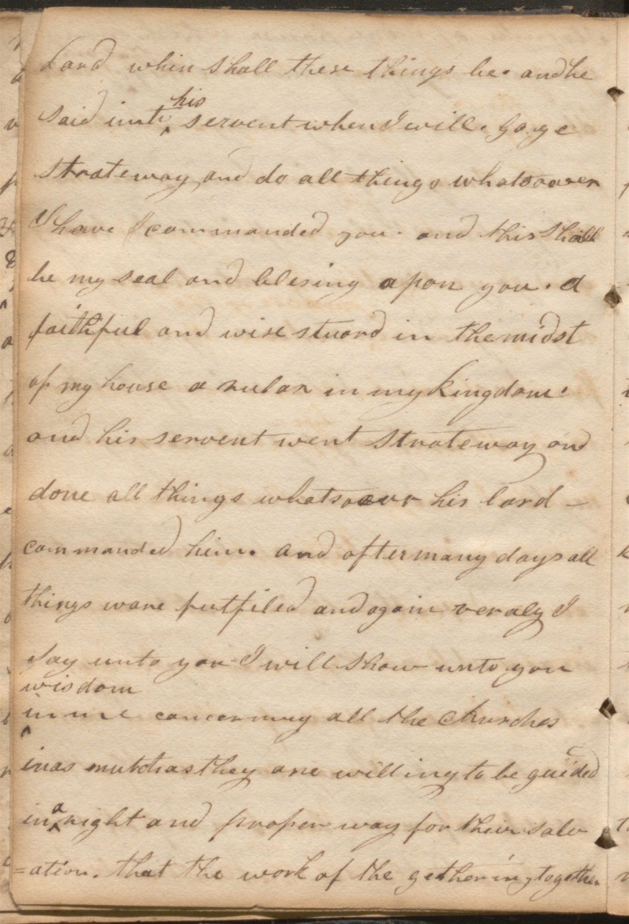 Lord when shall these things be. and he said unto <his> servent when I will. go ye strateway and do all things whatsoever I have I commanded you and this shall be my seal and blesing apon you. a faithful and wise in the midst of my house a rular in my kingdom. and his servent went strateway and done all things whatsoevr his lord— commanded him. and after many days all things ware fulfiled and again veraly I say unto you I will show unto you <wisdom> in me concerning all the inas mutch as they are willing to be guided in <a> right and proper way for their salvation. that the work of the together [p. [14]]