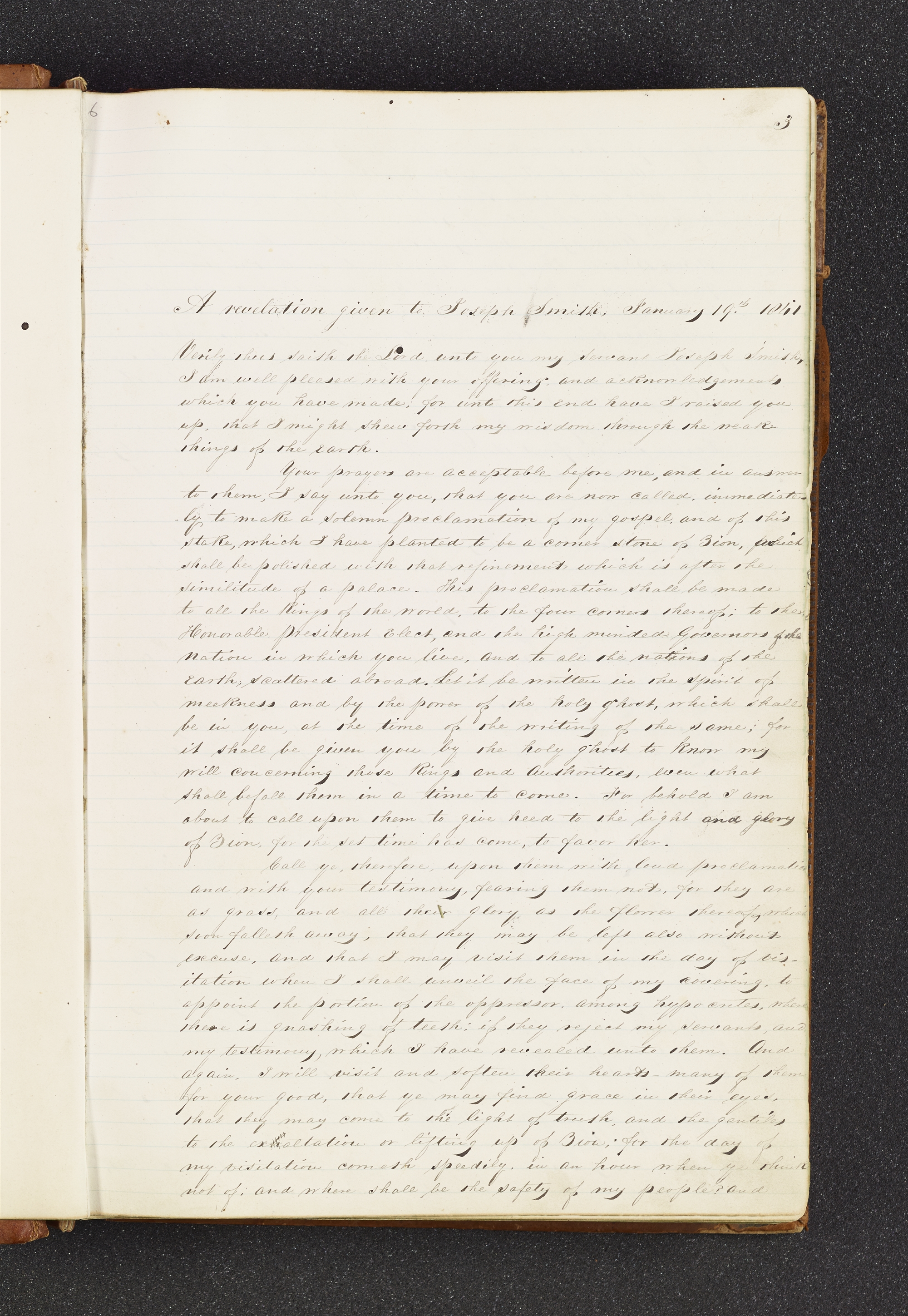 Later in the revelation, general church clerk Robert B. Thompson was instructed to assist with writing the proclamation. Though he began a draft of the proclamation, it was not complete by the time of his death in August 1841. In November 1843, JS renewed the instruction, directing Willard Richards, Orson Hyde, John Taylor, and William W. Phelps to write a proclamation “to the Kings &c of the earth.” The proclamation was not published prior to JS’s death and was eventually written by Parley P. Pratt and published in 1845 as Proclamation of the Twelve Apostles of the Church of Jesus Christ, of Latter-day Saints. To All the Kings of the World; To the President of the United States of America; To the Governors of the Several States; And to the Rulers and People of All Nations. (“A Religious Proclamation,” JS Collection, CHL; “Death of Col. Robert B. Thompson,” Times and Seasons, 1 Sept. 1841, 2:519; JS, Journal, 21 Nov. 1843; Proclamation of the Twelve Apostles, [1]; see also Crawley, Descriptive Bibliography, 1:294–296.)