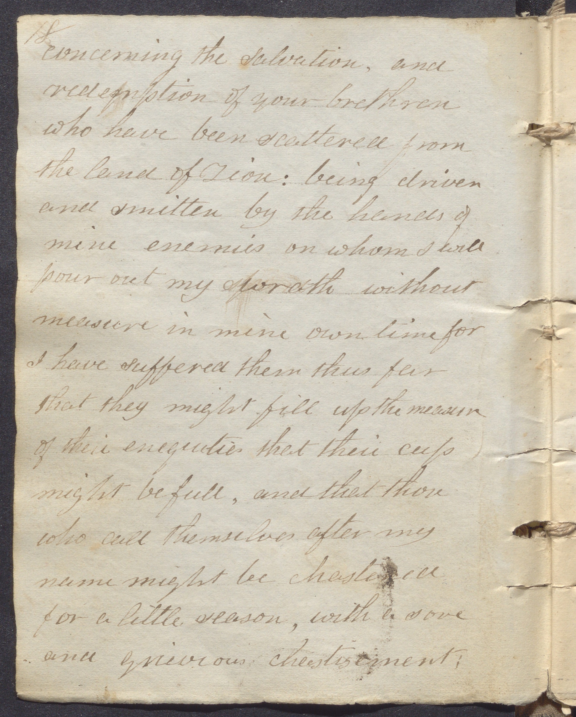 concerning the Salvation, and redemption of your brethren who have been scattered from the land of : being driven and smitten by the hands of mine enemies on whom I will pour out my sp wrath without measure in mine own time for I have suffered them thus far that they might fill up the measure of their enequities [iniquities] that their cup might be full, and that those who call themselves after my name might be chastened for a little season, with a sore and grievous chastisement; [p. 18]