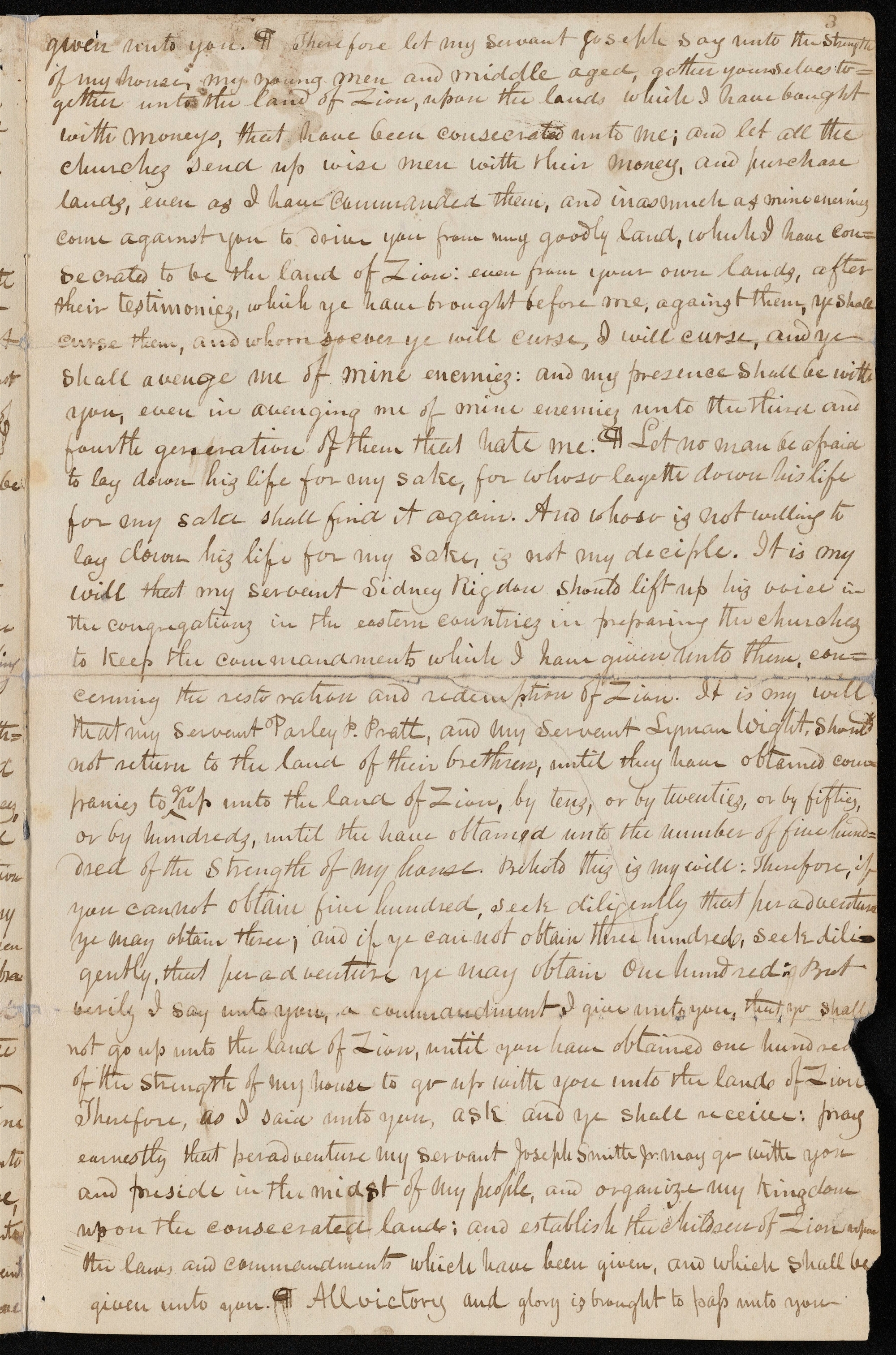 given unto you. ¶ Therefore let my servant Joseph say unto the strength of my house, my young men and middle aged, gather yourselves together unto the land of , upon the lands which I have bought with moneys, that have been unto me; and let all the send up wise men with their money, and purchase lands, even as I have commanded them, and inasmuch as mine enemies come against you to drive you from my goodly land, which I have consecrated to be the land of : even from your own lands, after their testimonies, which ye have brought before me, against them, ye shall curse them, and whomsoever ye will curse, I will curse, and ye shall avenge me of mine enemies: and my presence shall be with you, even in avenging me of mine enemies unto the third and fourth generation of them that hate me. ¶ Let no man be afraid to lay down his life for my sake, for whoso layeth down his life for my sake shall find it again. And whoso is not willing to lay down his life for my sake, is not my deciple. It is my will that my servant should lift up his voice in the congregations in the eastern countries in preparing the churches to keep the which I have given unto them, concerning the restoration and redemption of . It is my will that my servant , and my servant , should not return to the land of their brethren, until they have obtained companies to <go> up unto the land of , by tens, or by twenties, or by fifties, or by hundreds, until the[y] have obtained unto the number of five hunddred of the strength of my house. Behold this is my will: Therefore, if you cannot obtain five hundred, seek diligently that peradventure ye may obtain three; and if you cannot obtain three hundred, seek diligently, that peradventure ye may obtain one hundred: But verily I say unto you, a commandment I give unto you, that ye shall not go up unto the land of , until you have obtained one hundred of the strength of my house to go up with you unto the land of . Therefore, as I said unto you, ask and ye shall receive: pray earnestly that peradventure my servant Joseph Smith Jr. may go with you and preside in the midst of my people, and organize my kingdom upon the consecrated land; and establish the children of upon the laws and commandments which have been given, and which shall be given unto you. ¶ All victory and glory is brought to pass unto you [p. 3]