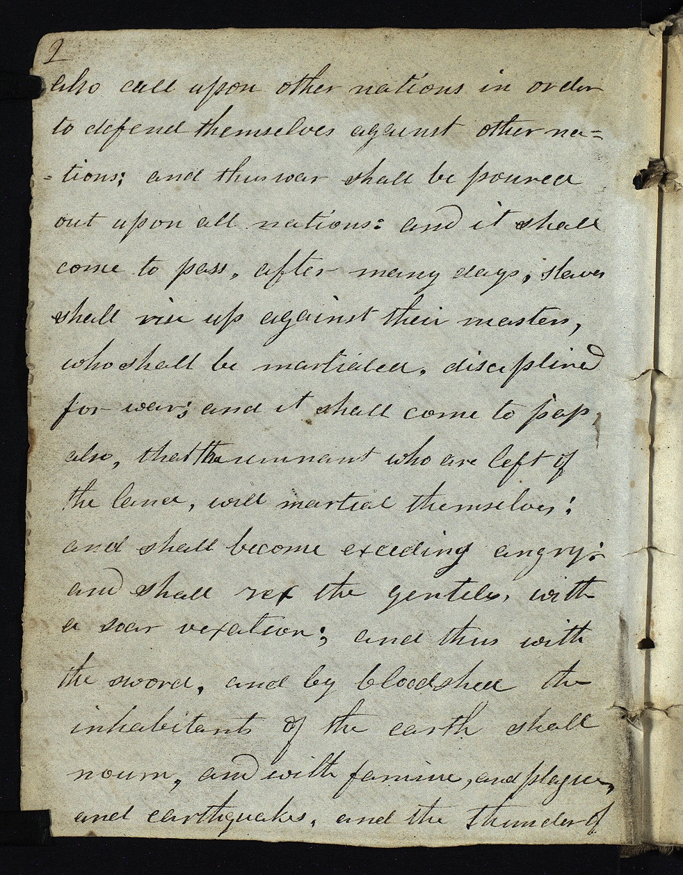 who call upon other nations in order to defend themselves against other nations; and thus war shall be poured out upon all nations: and it shall come to pass, after many days, slaves shall rise up against their masters, who shall be martialed, disciplined for war; and it shall come to pass also, that the remnant who are left of the land, will martial themselves; and shall become exceding angry: and shall vex the , with a soar vexation; and thus with the sword, and by bloodshed the inhabitants of the earth shall mourn, and with famine, and plague, and earthquakes, and the thunder of [p. 2]