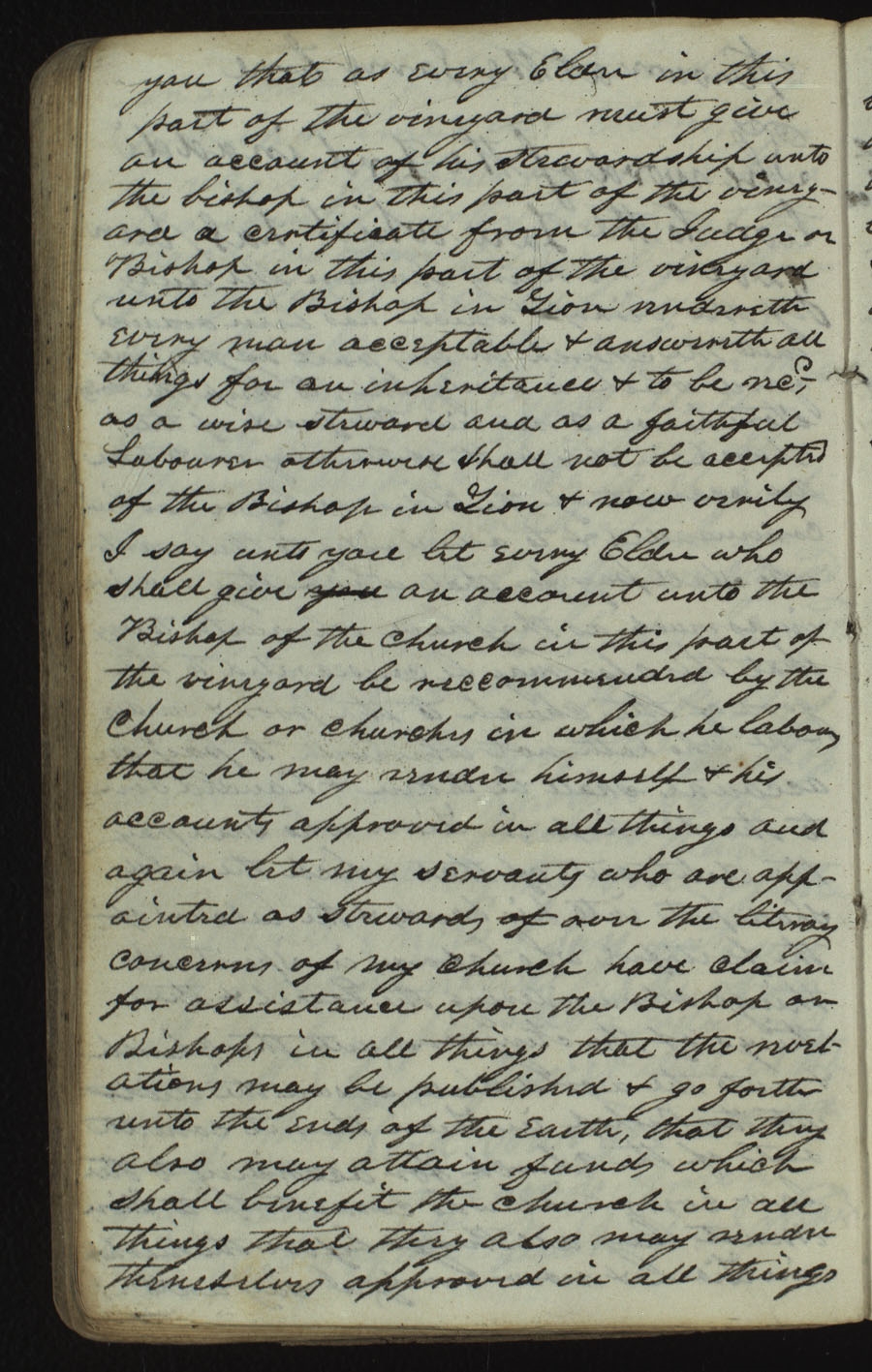 you that as every in this part of the vineyard must give an account of his stewardship unto the in this part of the vineyard a certificate from the Judge or Bishop in this part of the vineyard unto the Bishop in rendereth every man acceptable & answereth all things for an & to be recd. as a wise and as a faithful Labourer otherewise shall not be accepted of the Bishop in & now verily I say unto you let every Elder who shall give you an account unto the Bishop of the in this part of the vineyard be reccommended by the Church or churches in which he labors that he may render himself & his accounts approved in all things and again let my servants who are appointed as stewards of over the litera[r]y concerns of my church have claim for assistance upon the Bishop or Bishops in all things that the revelations may be published & go forth unto the ends of the earth, that they also may attain funds which shall benefit the church in all things that they also may render themselves approved in all things [p. [51]]