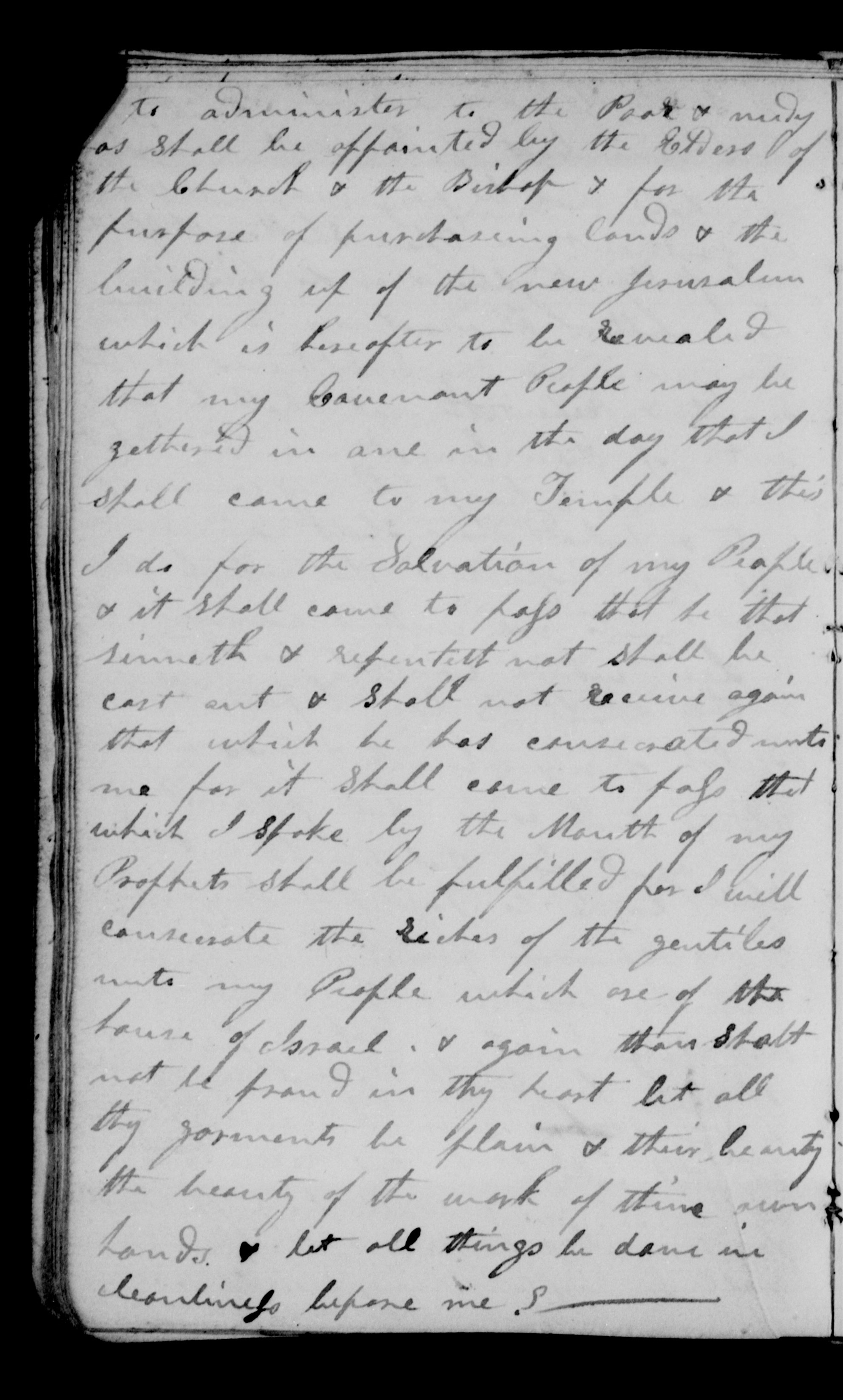 to administer to the Poor & needy as shall be appointed by the of the Church & the & for the purpose of purchasing lands & the building up of the which is hereafter to be revealed that my Covenant People may be gethered in one in the day that I shall come to my & this I do for the Salvation of my People & it is shall come to pass that he that sinneth & repenteth not shall be cast out & shall not receive again that which he has consecrated unto me for it shall come to pass that which I spoke by the Mouth of my Prophets shall be fulfilled for I will consecrate the riches of the unto my People which are of the . & again thou shalt not be proud in thy heart let all thy garments be plain & their beauty the beauty of the work of thine own hands. & let all things be done in cleanliness before me—— [p. [14]]