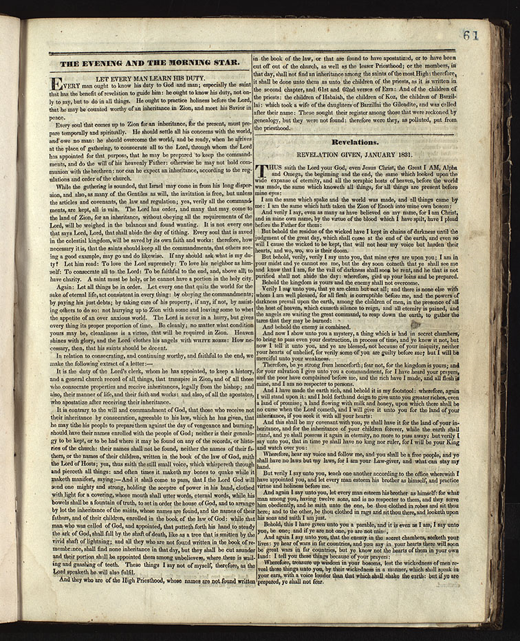 Revelation, 2 Jan. 1831, in “Revelation Given, January 1831,” The Evening and the Morning Star, Jan. 1833, [5]–[6] [D&C 38]. This version reflects editing marks made in Revelation Book 1, indicating that the latter was used as a source text for the former.